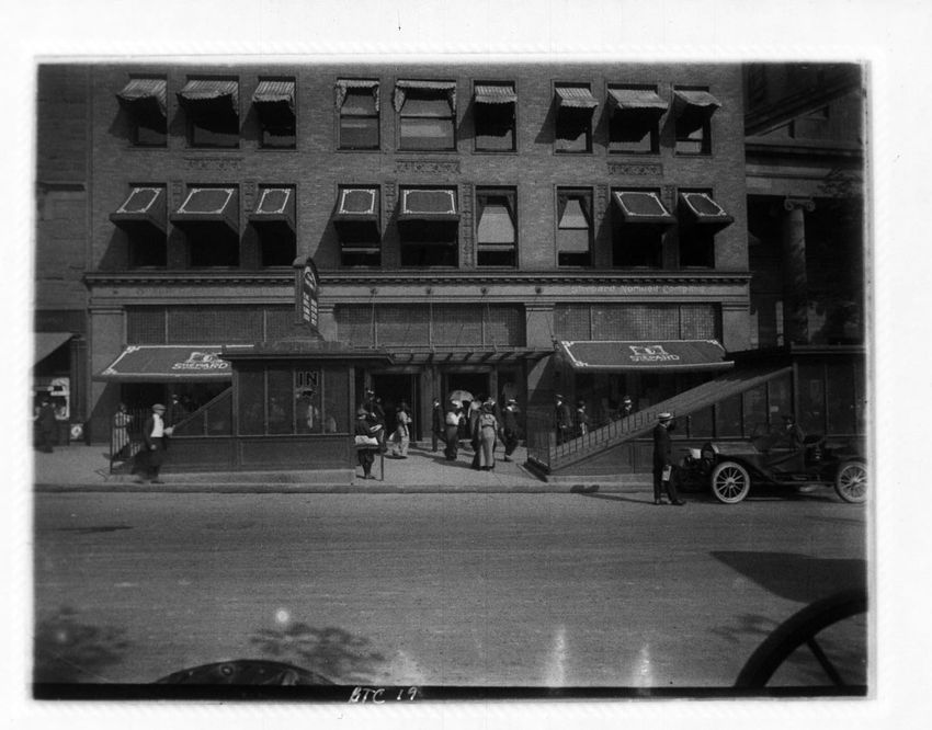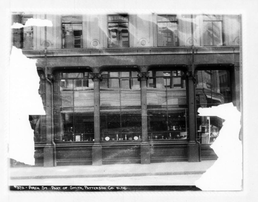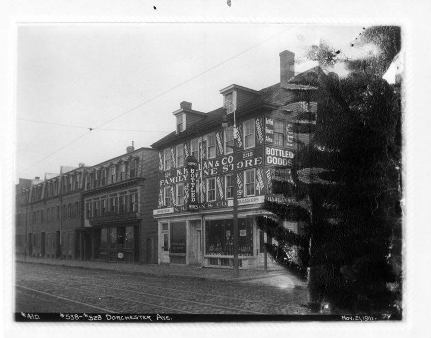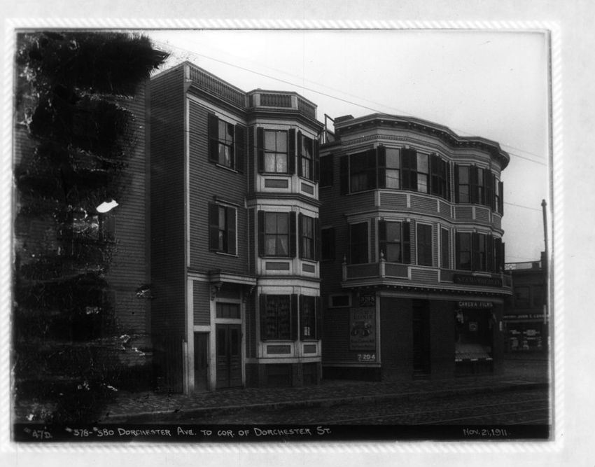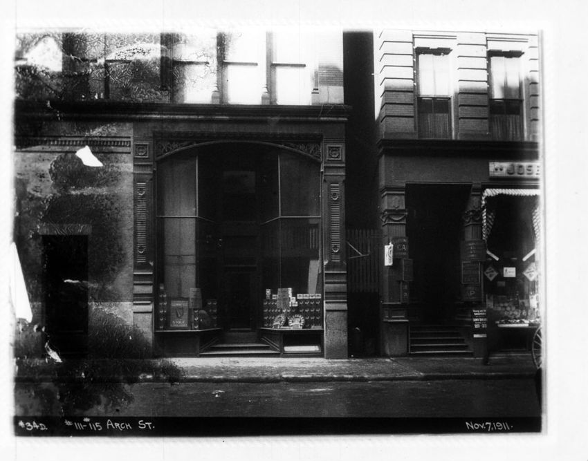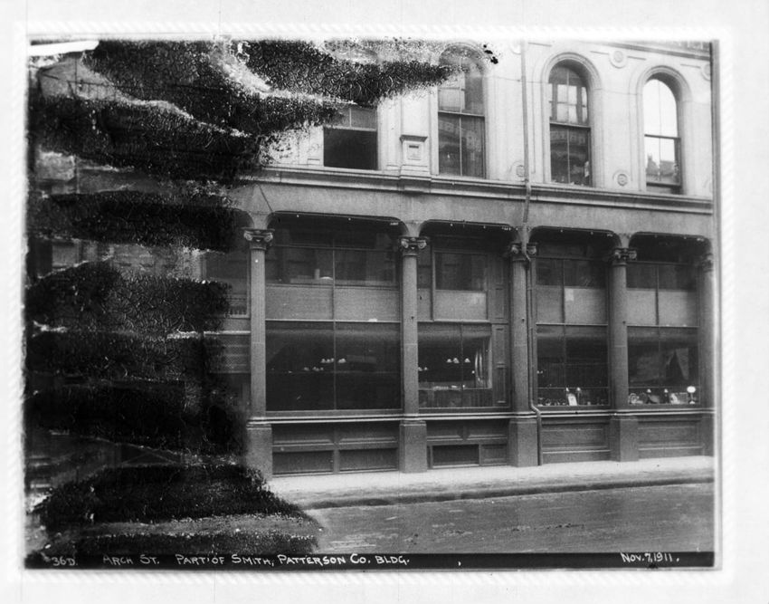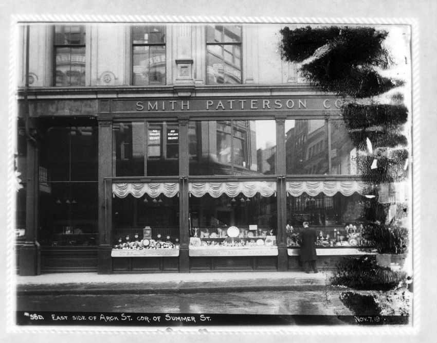 Pedestrians are in front of Cobb, Bates & Yerxa, groceries, at 55-61 Summer Street. S.W. Loomis, clothing, is to left at 63 Summer. The Larkin Company, soap and other products, is on the second floor.
