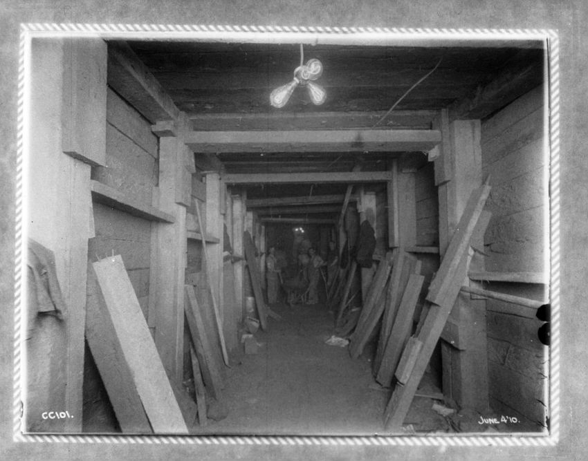 Inside a tunnel lit with electric light and group of men in the background