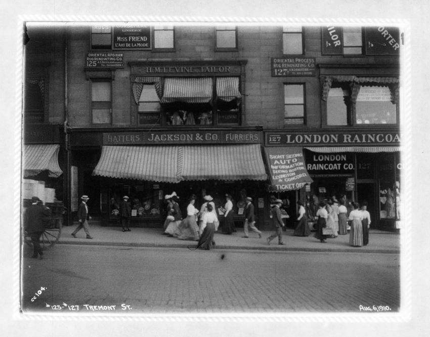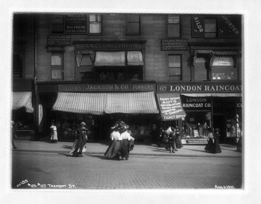 Jackson & Company, hatters and furriers is next to the London Raincoat Company. Between the two is a ticket office for Sighseeing Auto, information seeing Boston, Lexington & Concord.