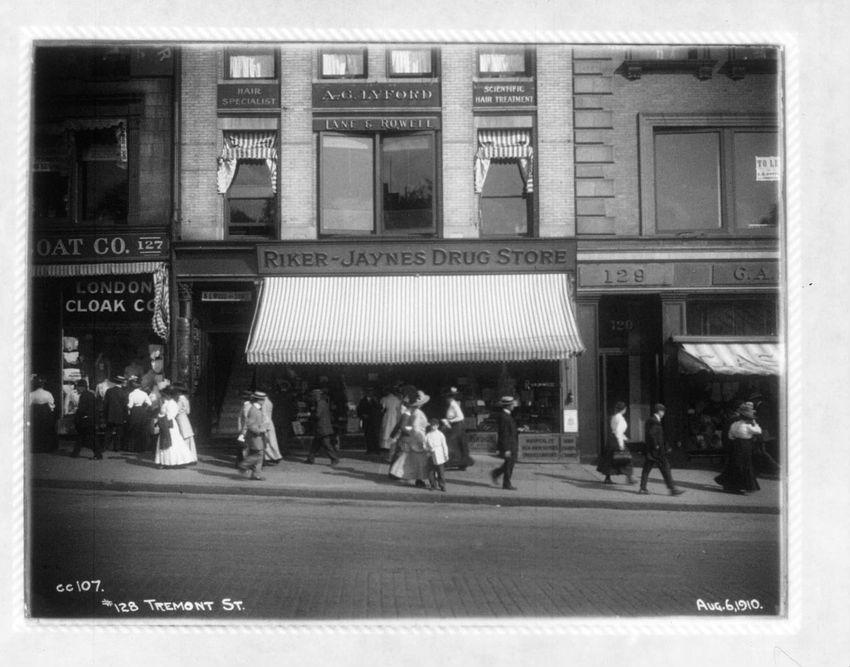 Riker and Jaynes Drug Store can be seen at 128 Tremont to the left of the George A. Sawyer men's clothing store.