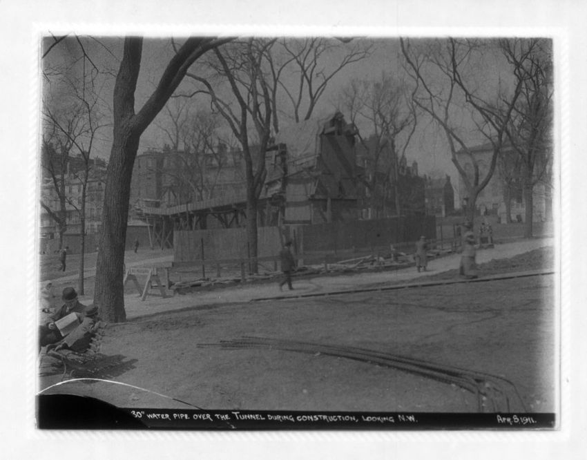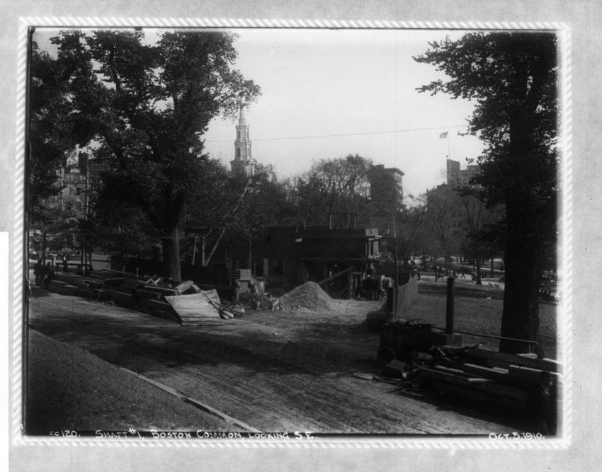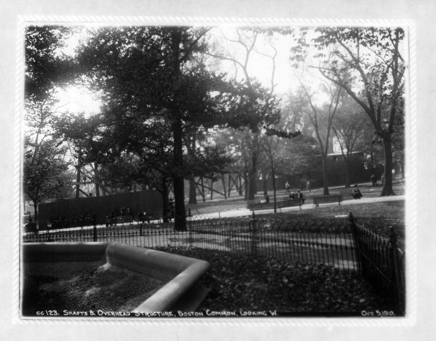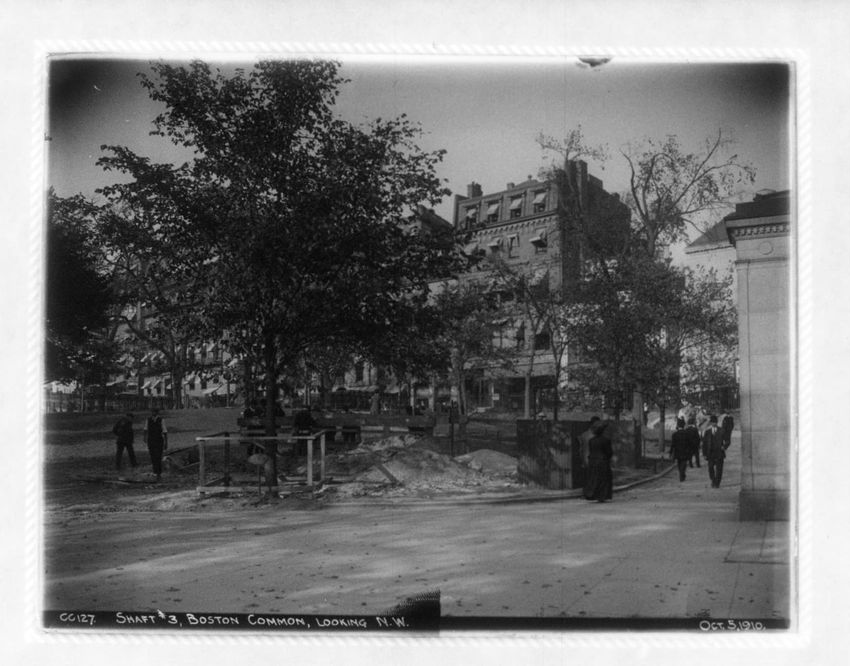 The subway construction shaft on Boston Common can be seen looking in the direction of Beacon Street.