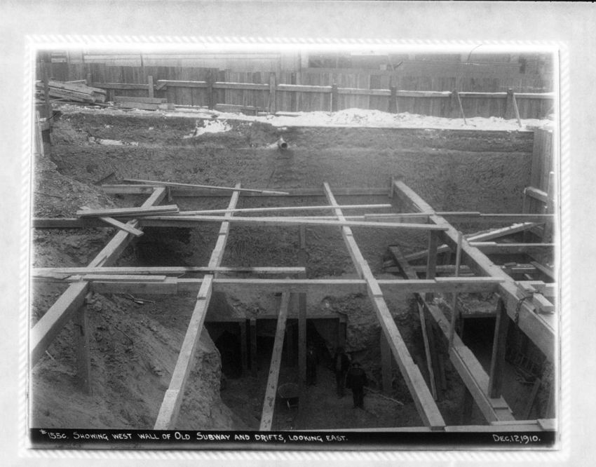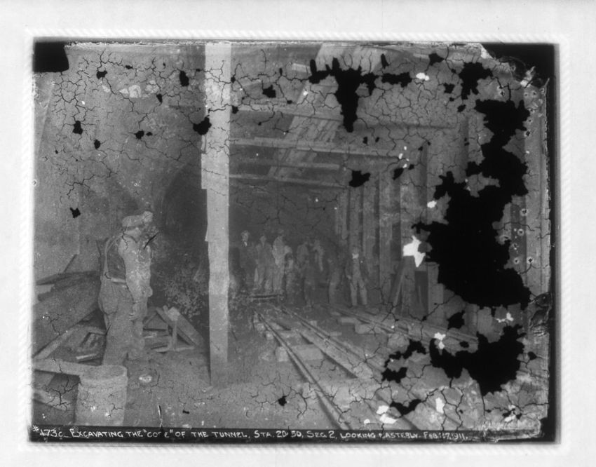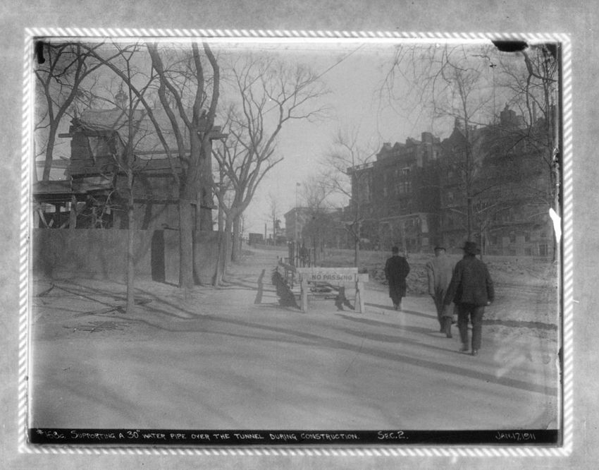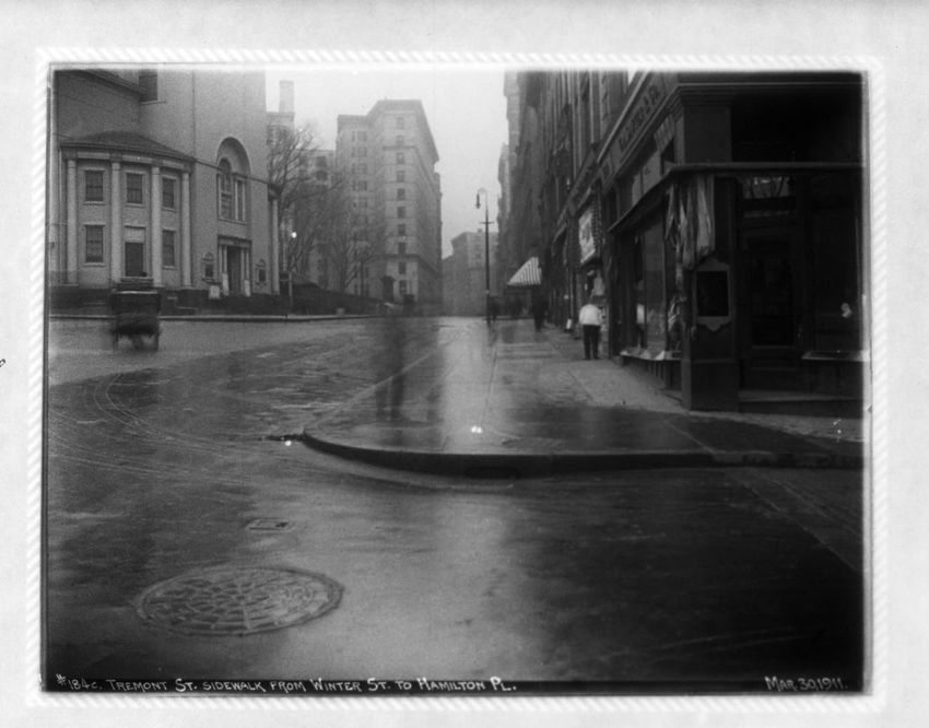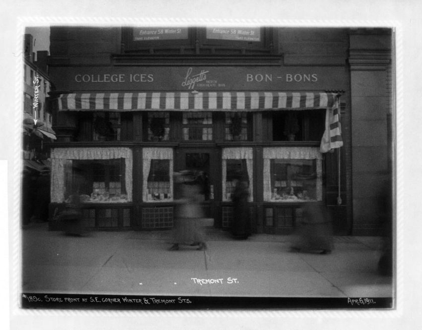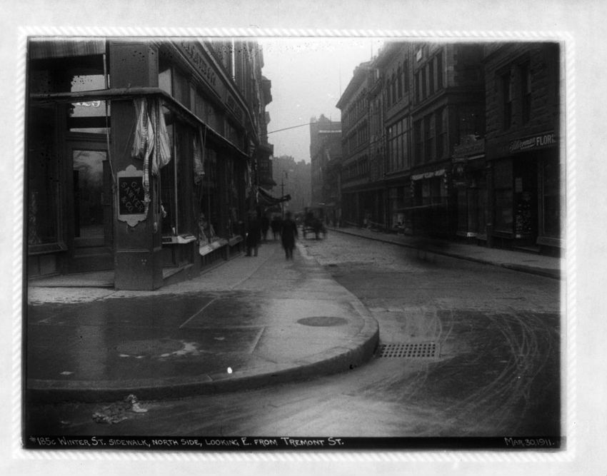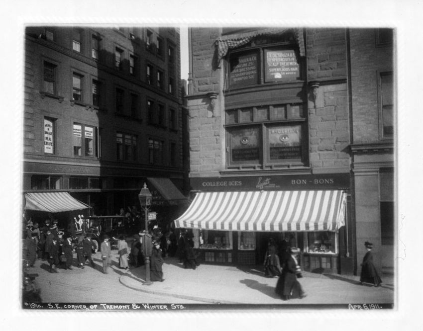 A candy shop can be seen on the right side of the image at the corner of Winter and Tremont Streets. George A. Sawyer and Company, men's clothing, can be seen on the left side of the image. Downtown Crossing is in the distance. A photographer or surveyor has his back to the camera.