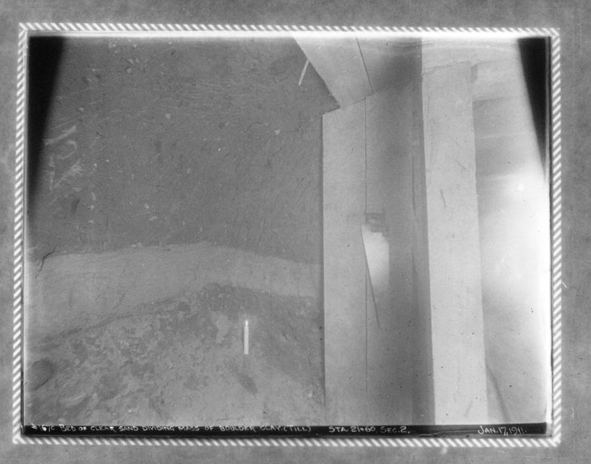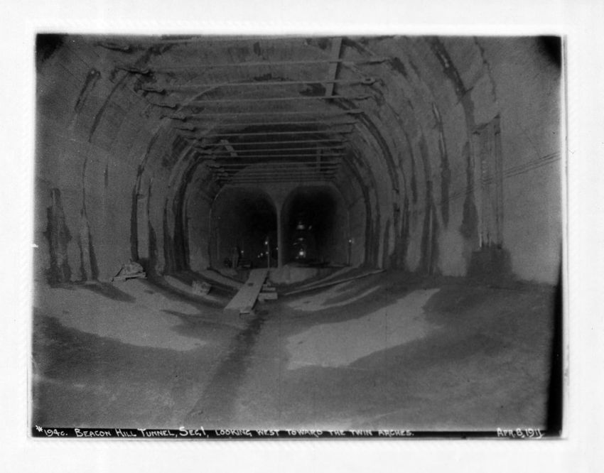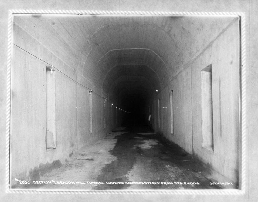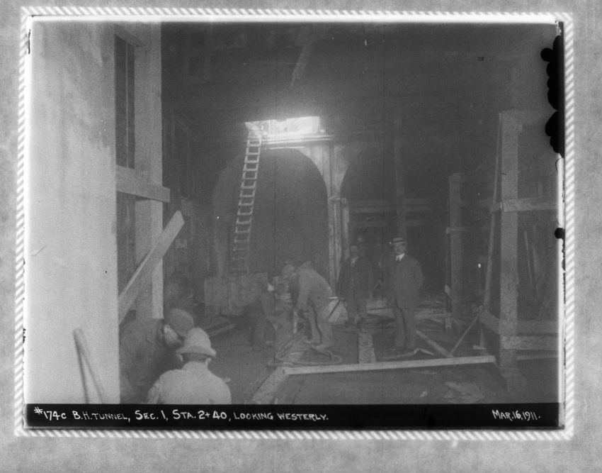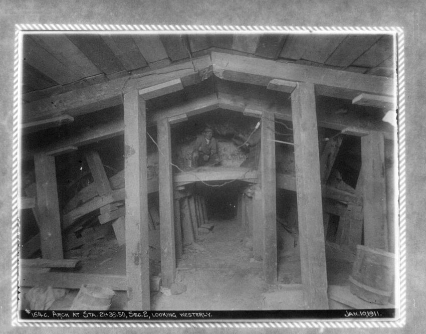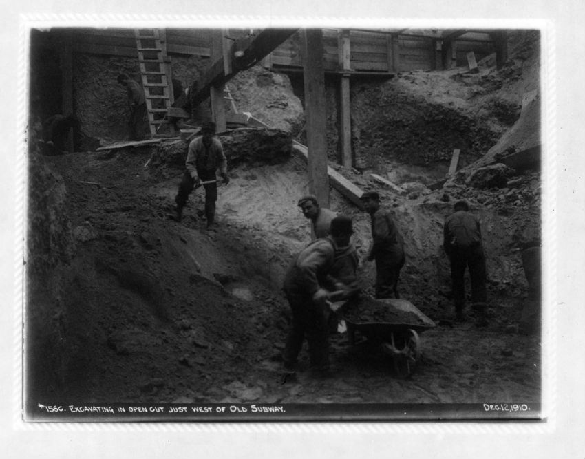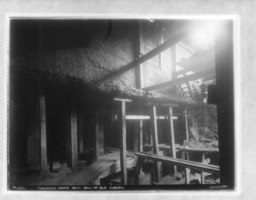 A candy shop can be seen on the right side of the image at the corner of Winter and Tremont Streets. George A. Sawyer and Company, men's clothing, can be seen on the left side of the image. Downtown Crossing is in the distance. A photographer or surveyor has his back to the camera.