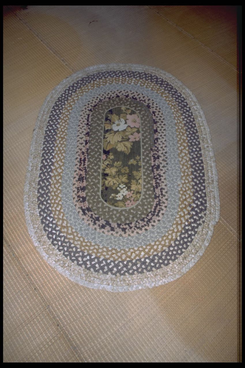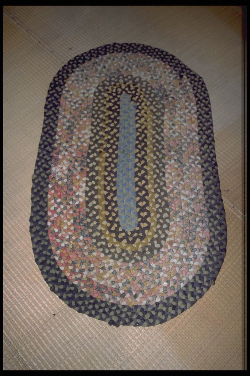 Braided rug with Brussels carpet center. Blue thick border, grey, red, green and pink surrounding green carpet with yellow and red floral sprays.