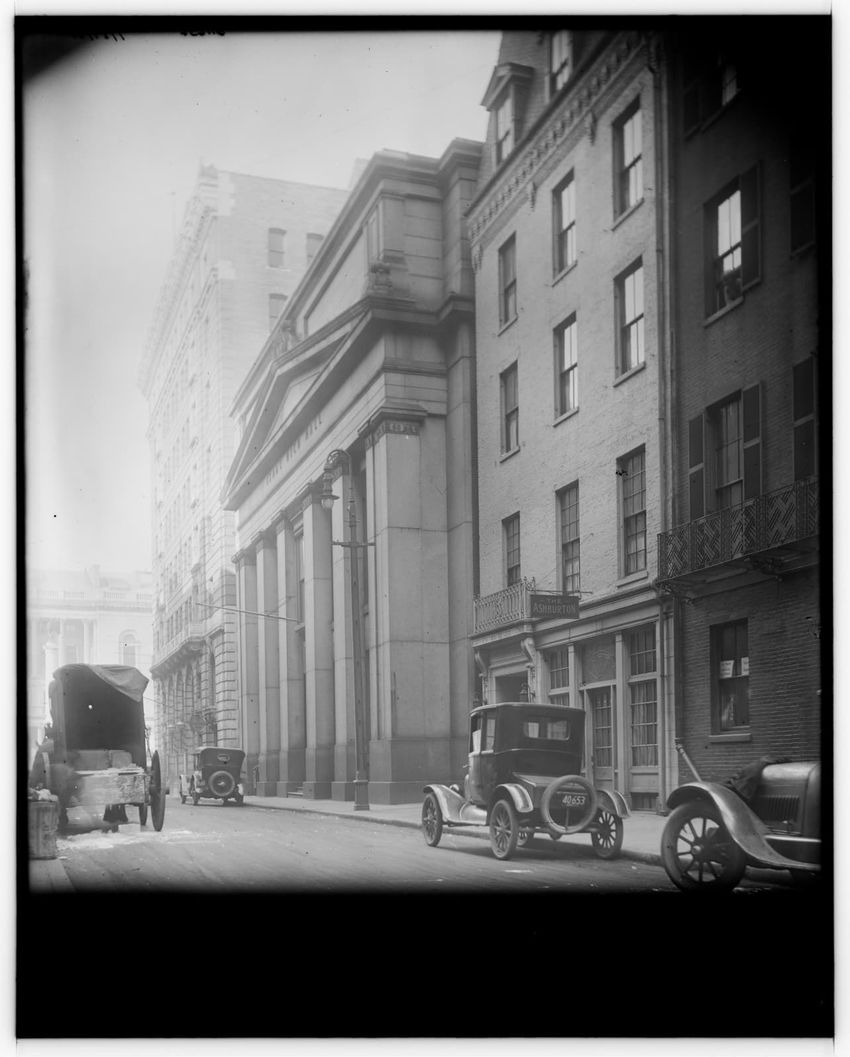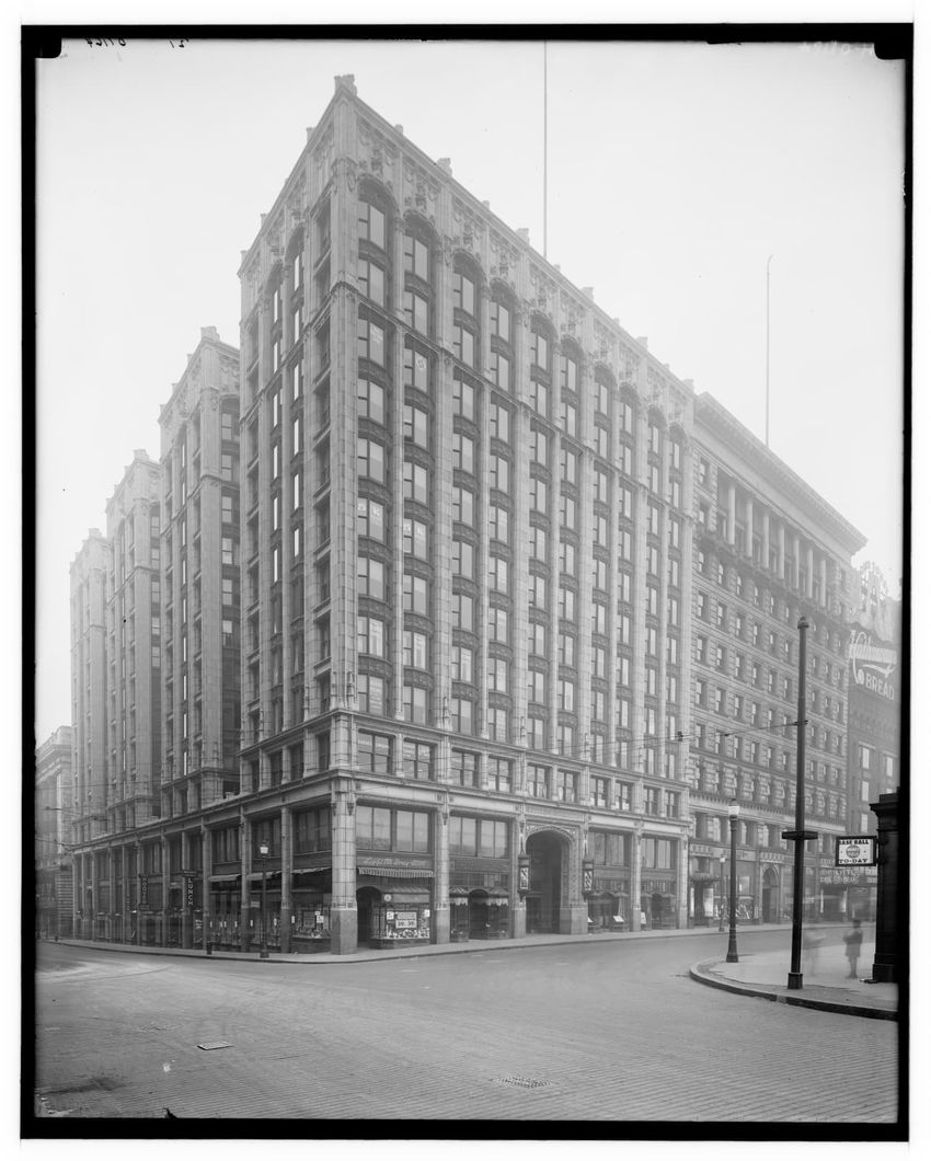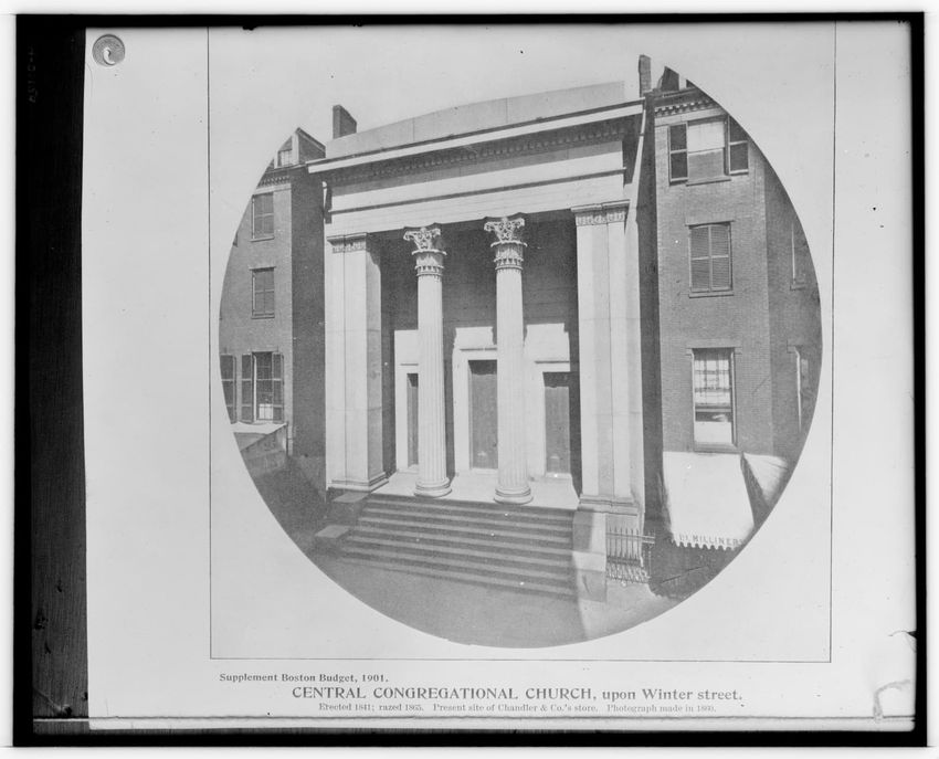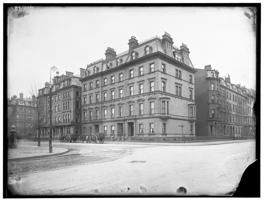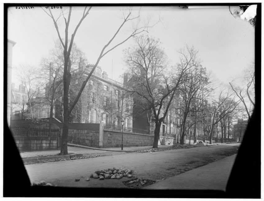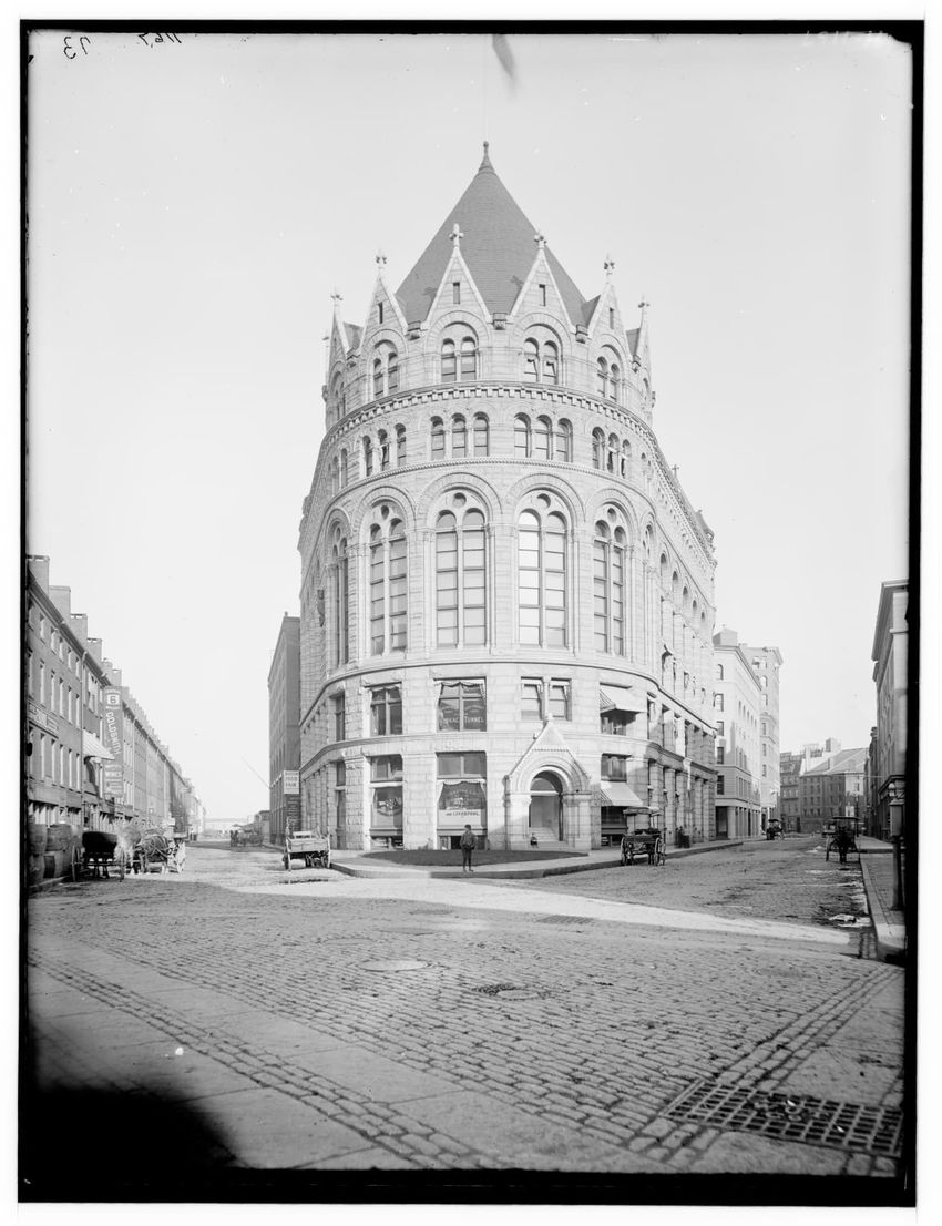The image depicts Tremont Street in Boston, Massachusetts. The street is bustling with activity, featuring pedestrians and early 20th-century vehicles. On the right side, there are multiple multi-story buildings displaying various signs, one of which reads "THOS. A. ELSTON CO. INC." In the foregroun...