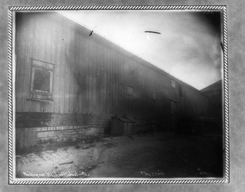Interior wooden building corner of Washington and School Sts.