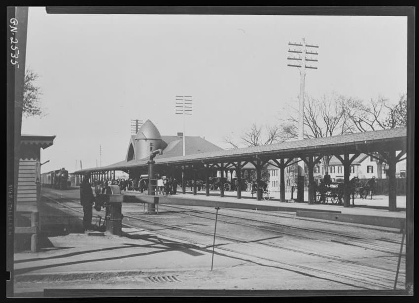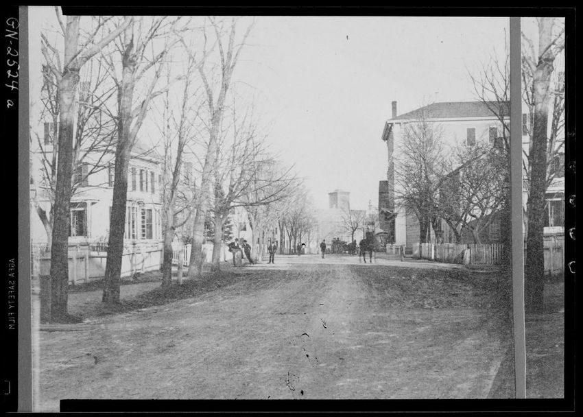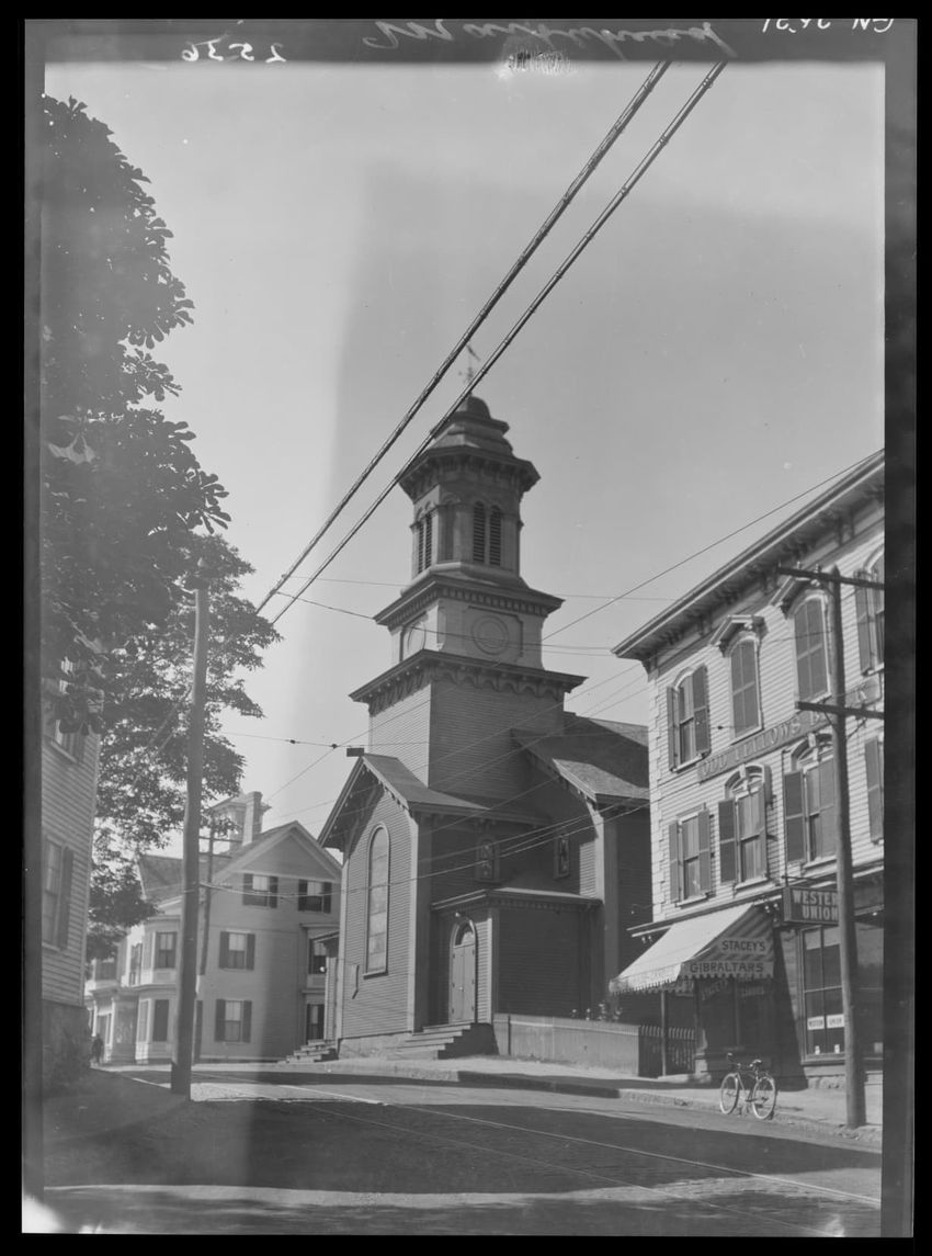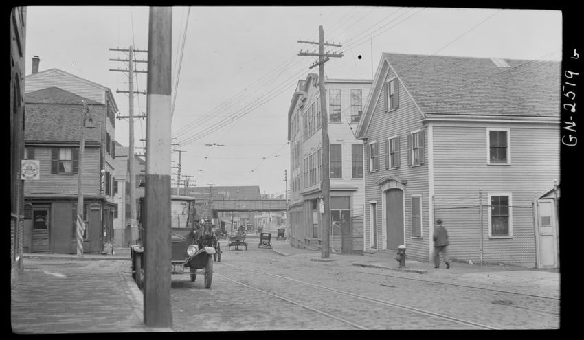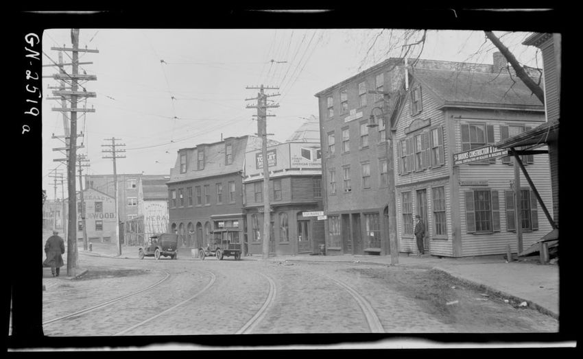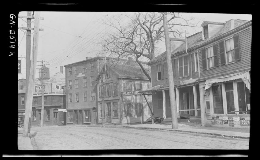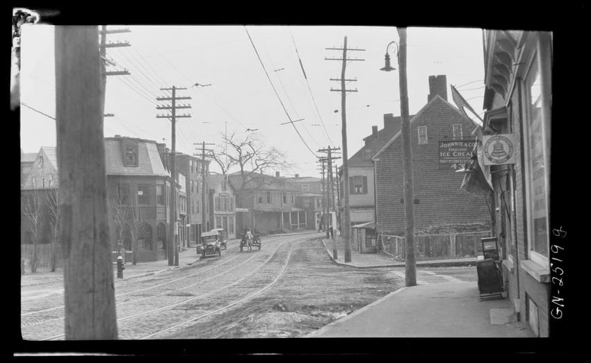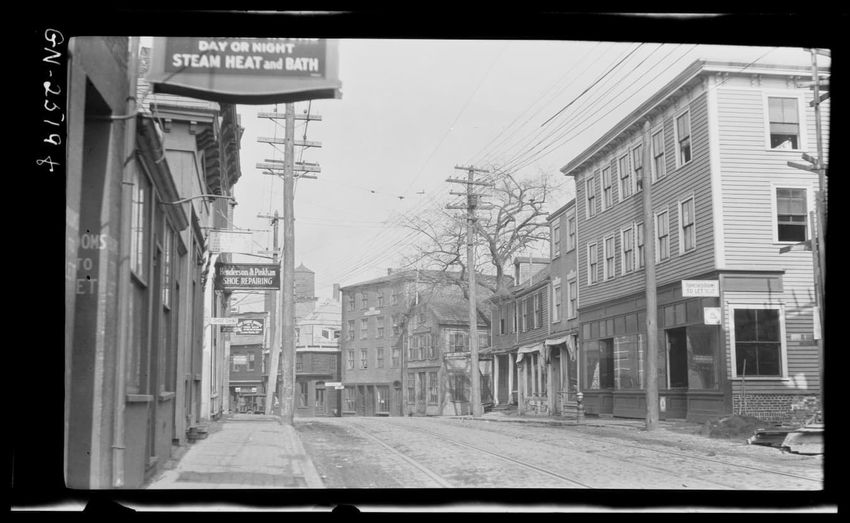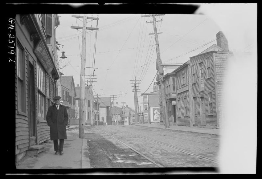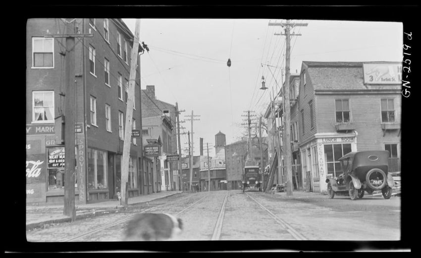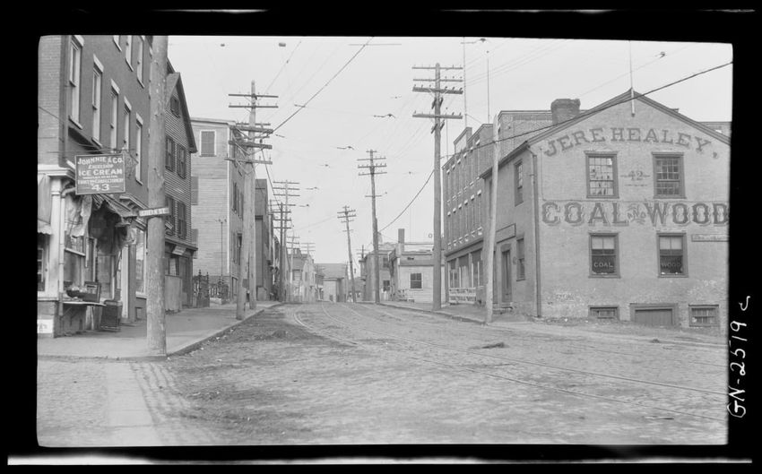 The image depicts Merrimac Street in Newburyport, Massachusetts. Visible are cobblestone streets with streetcar tracks, telephone poles lining the sides, and a series of buildings. To the right is a building labeled "Jere Healey, Coal and Wood," while on the left, there is a shop with a sign reading...