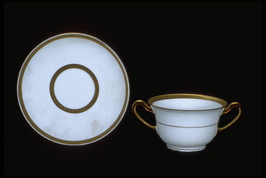 A)--Cups w/ panelled shaped sides, flaring rim and circular foot ring w/ squared "C" shape handle. Banded in gold at inner rim, foot ring, and interior bowl bottom. B)--Saucers w/ circular form w/ sloping panelled rims and circular well. Banded in gold at interior rim and at well.