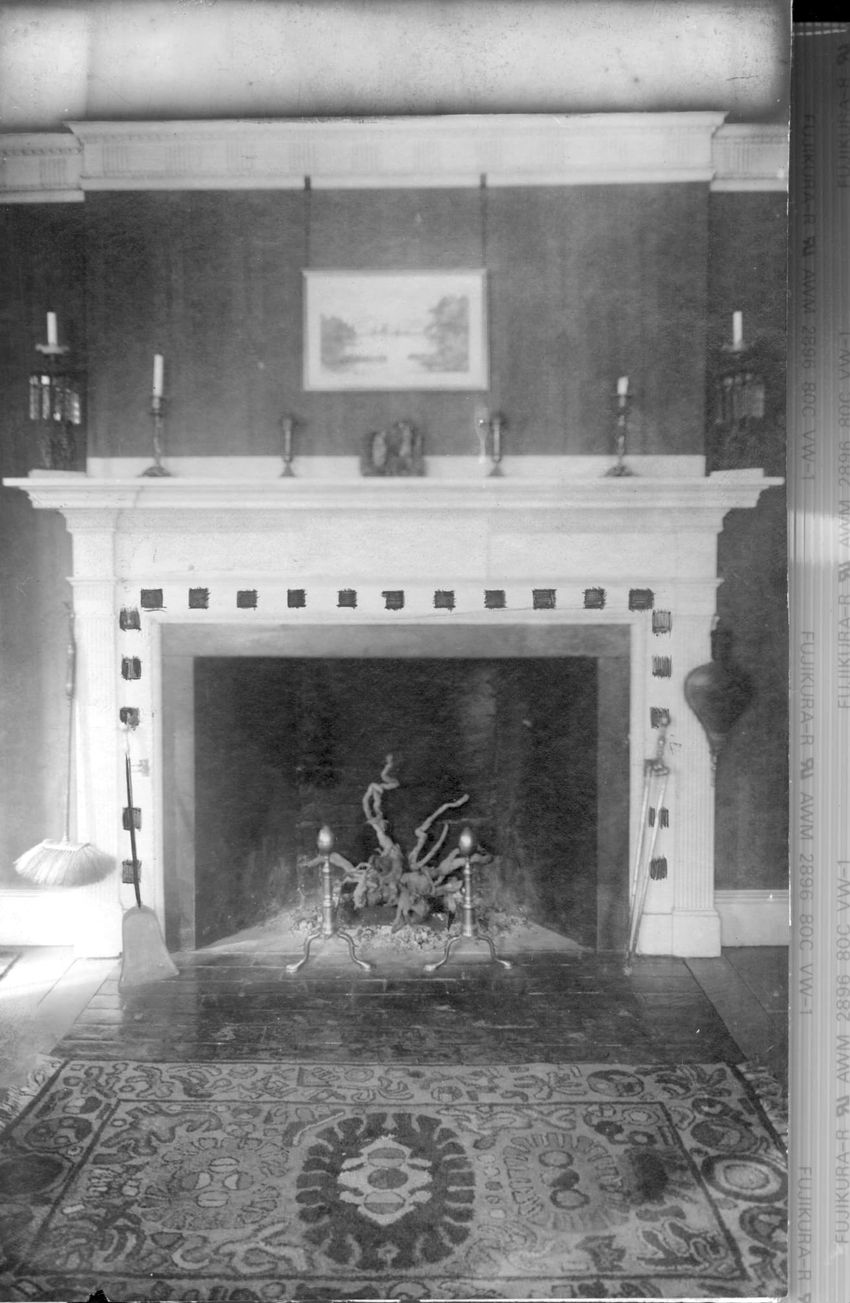 Interior photograph of the fireplace in the Lovett House, Beverly, Mass.