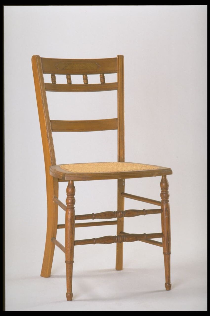 Each w/ rectangular crest w/ (?) panel enclosed by horizontal grooves over 4 short ring turned spindles and medial slat w/ third slat below joined by grooved stiles over trapezoidal caned seat w/ molded rail. Raised on turned front legs ending in "spade" feet. The front legs joined by paired turned ...