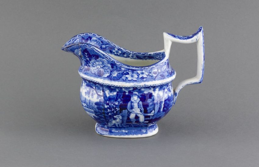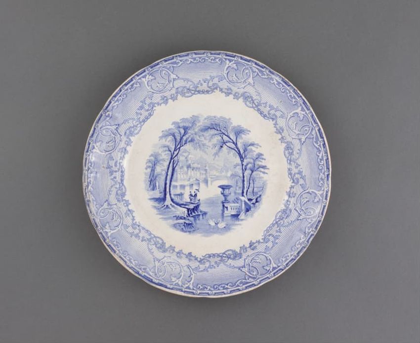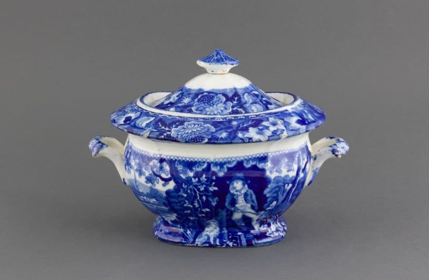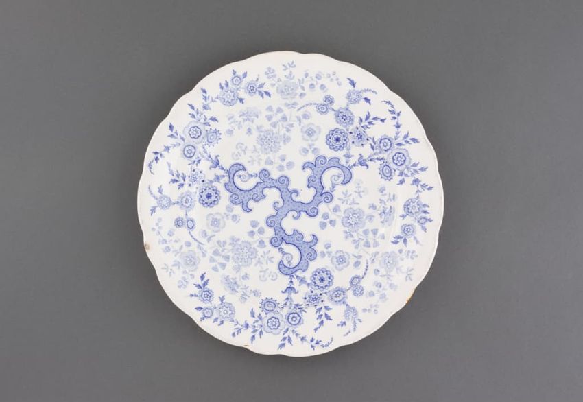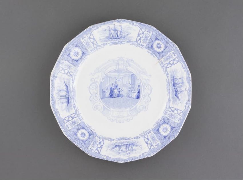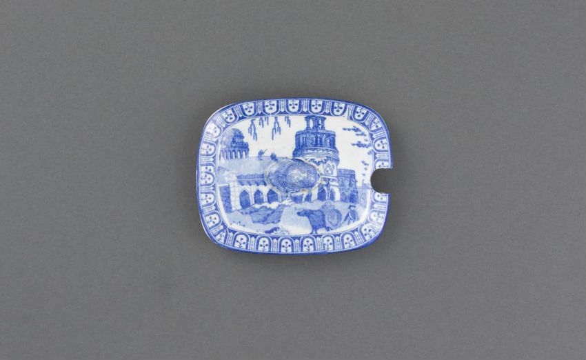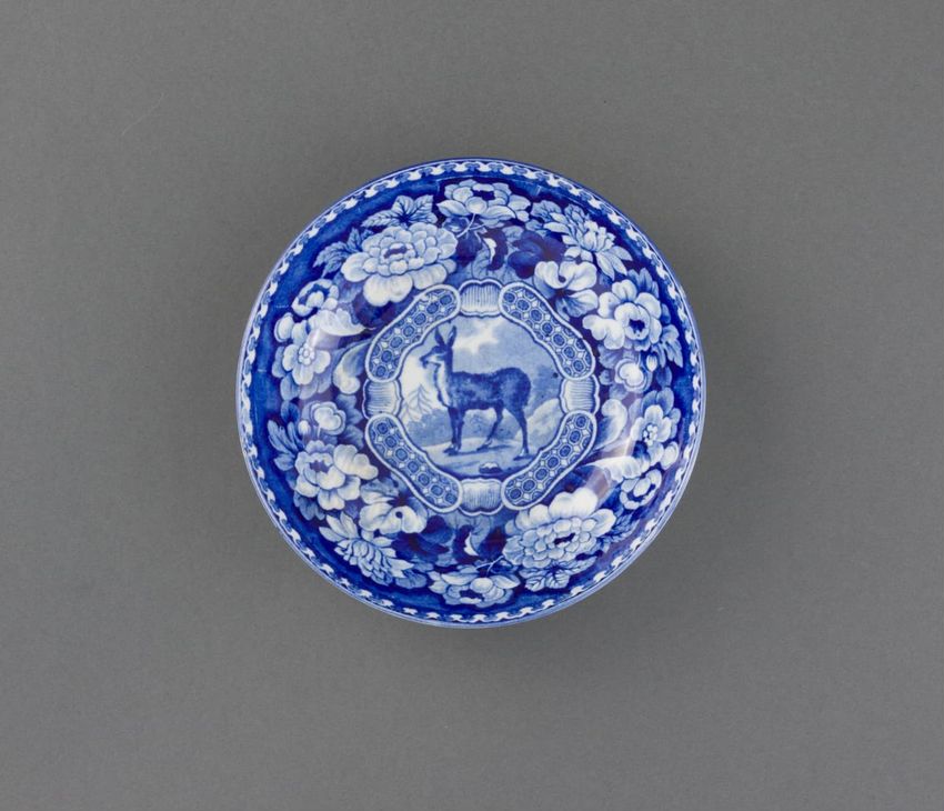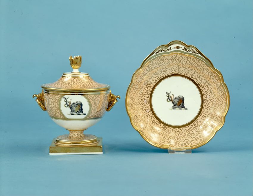 Gilt gold banded edge; border of gilt vermicule on pink ground; central image of elephant's head w/ snake entwined around trunk w/ green-gilt decoration (Appleton family crest). Oval w/ 2 tab handles.