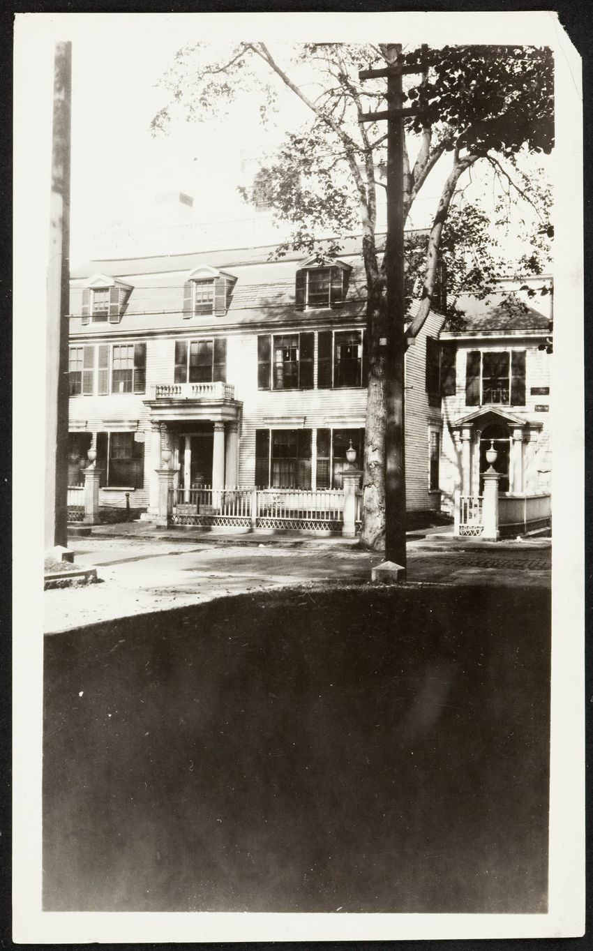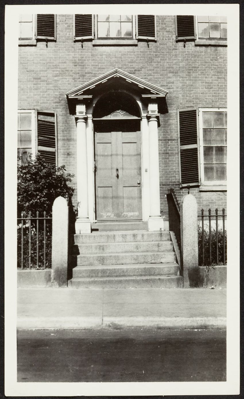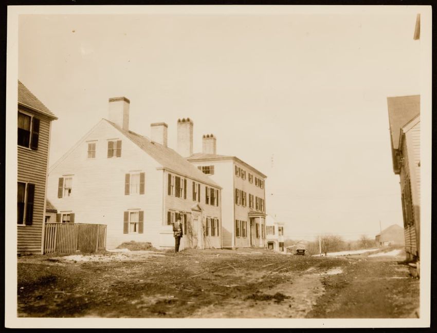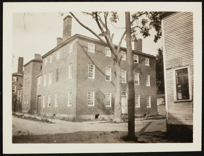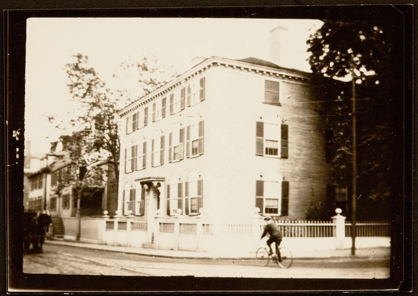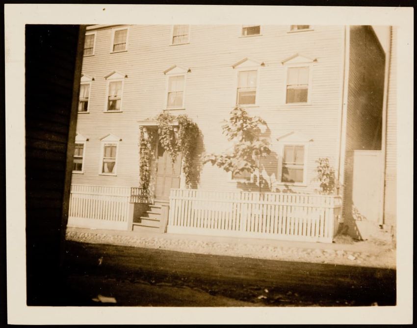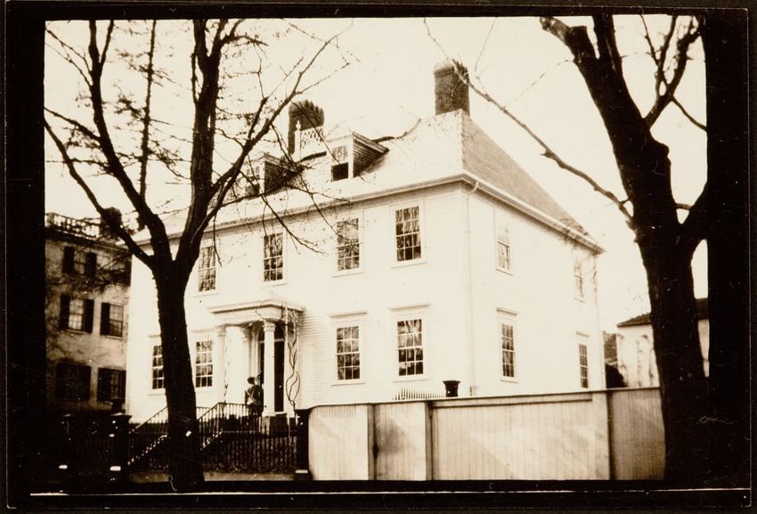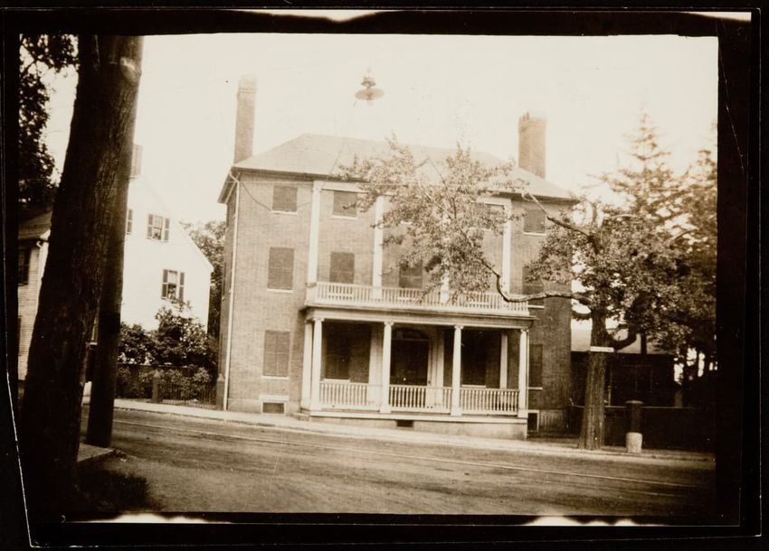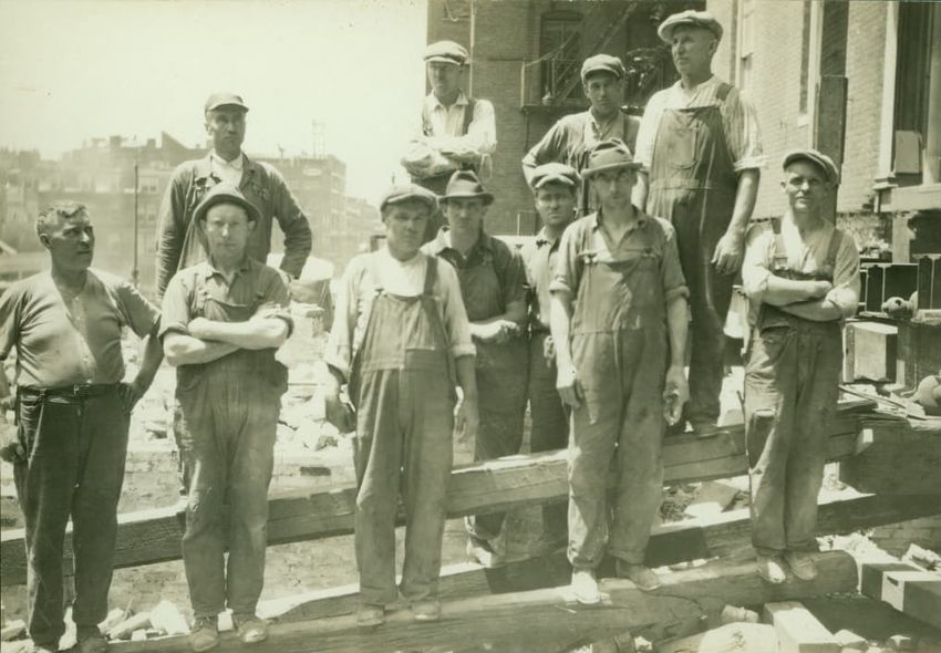 A group of workers pose in front of the Harrison Gray Otis House in preparation for the widening of Cambridge Street. Jim McCool (middle of front row), foreman for Isaac Blair & Co., the move contractor, is shown in the middle of the front row.
