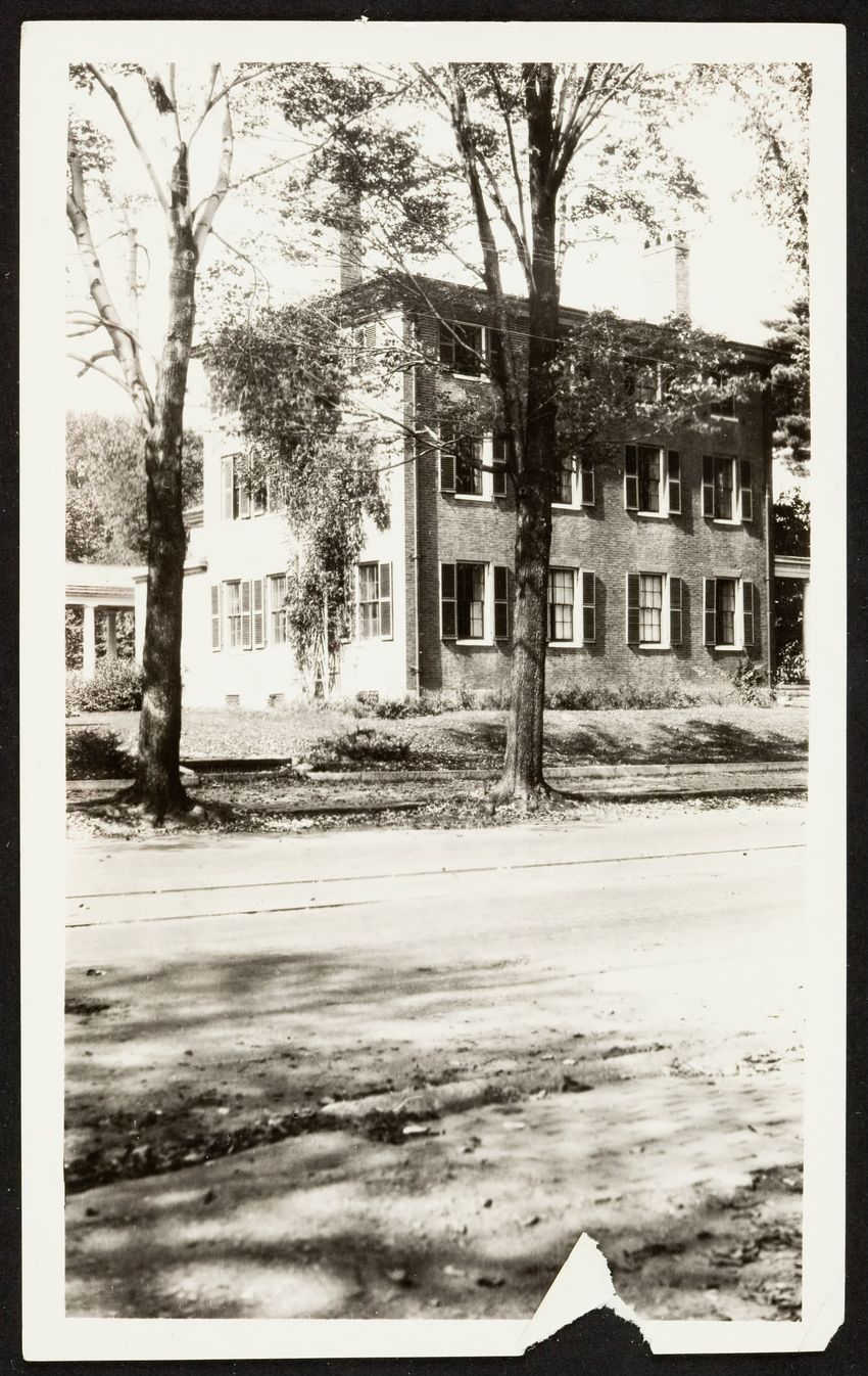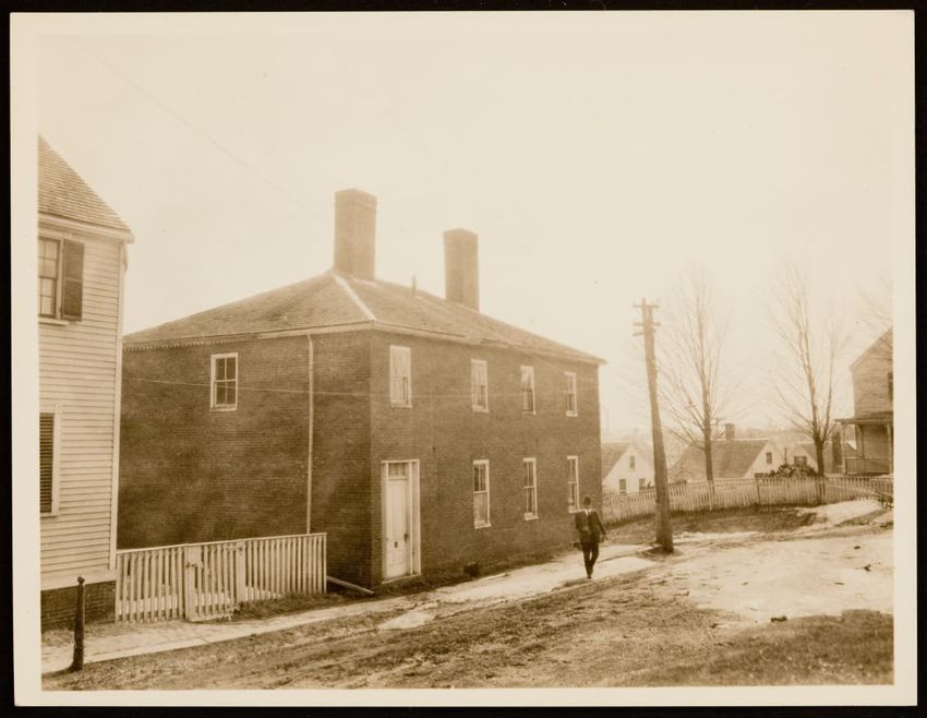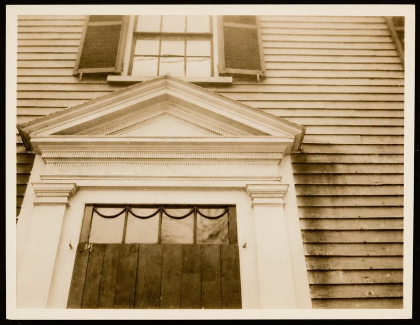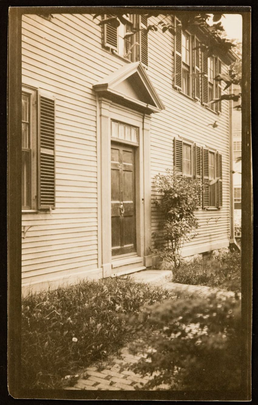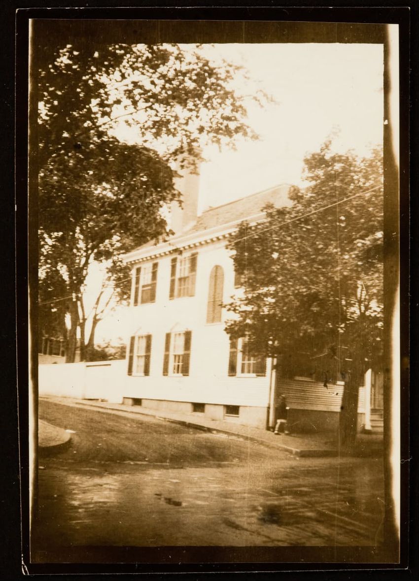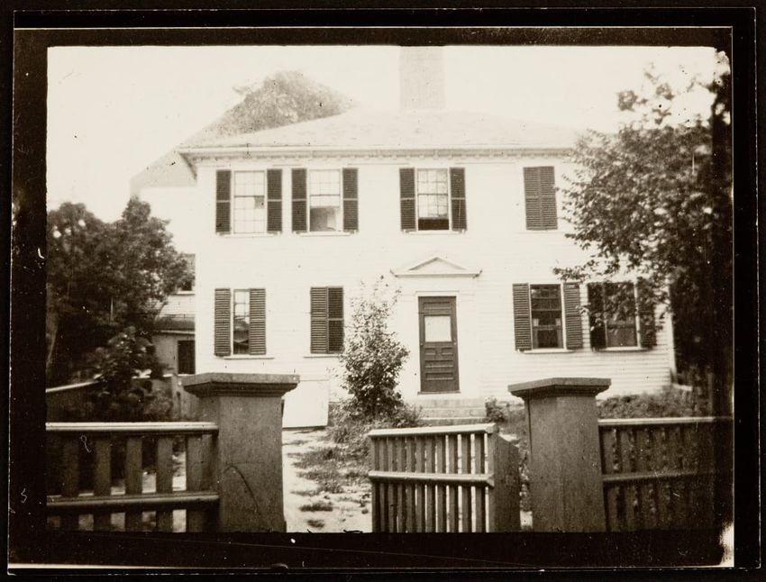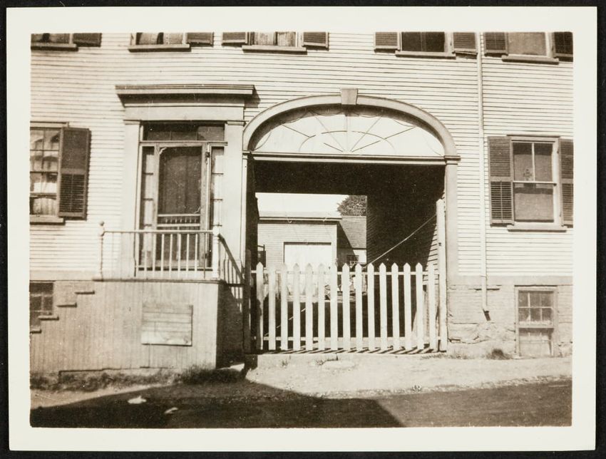 A group of workers pose in front of the Harrison Gray Otis House in preparation for the widening of Cambridge Street. Jim McCool (middle of front row), foreman for Isaac Blair & Co., the move contractor, is shown in the middle of the front row.