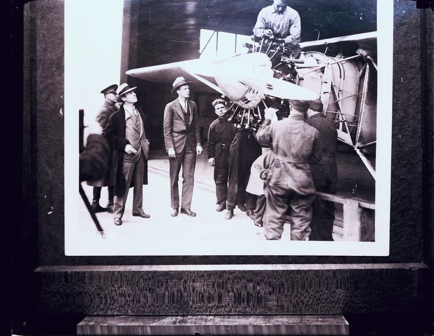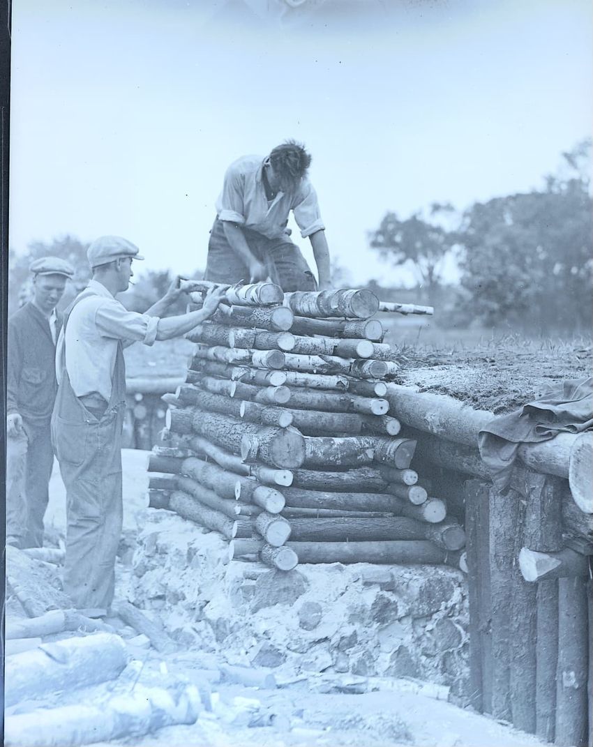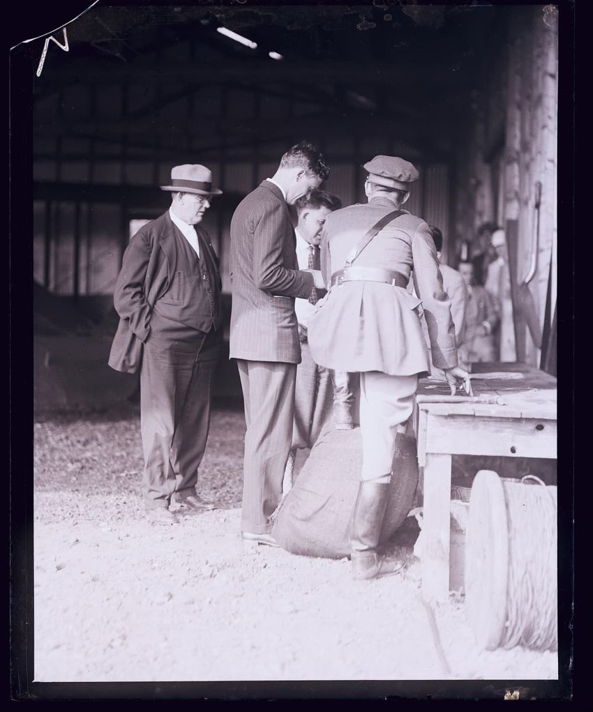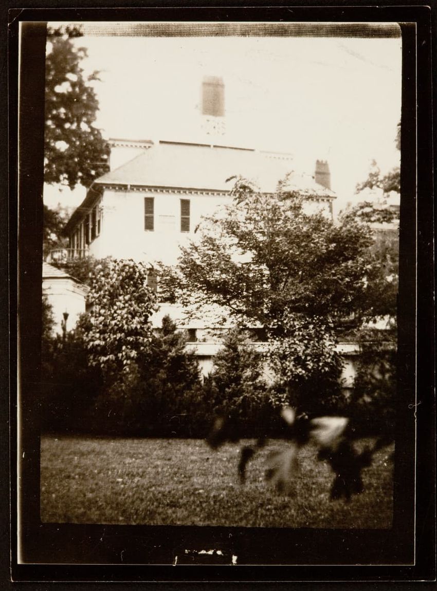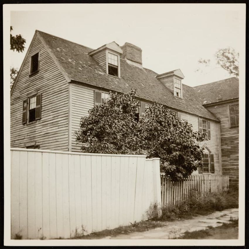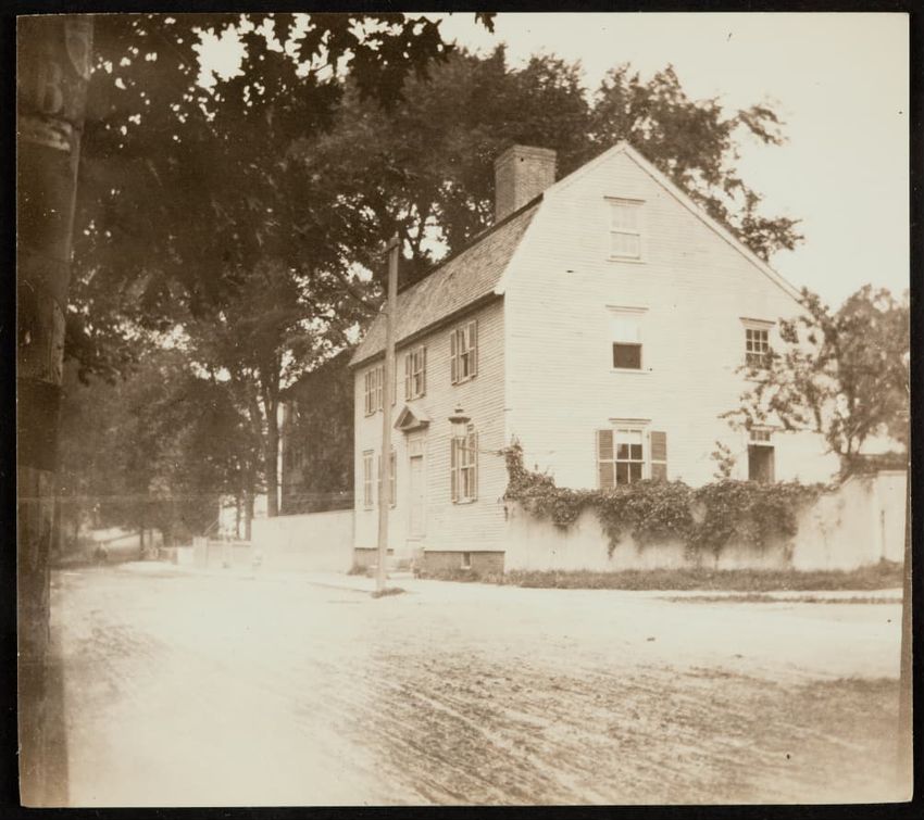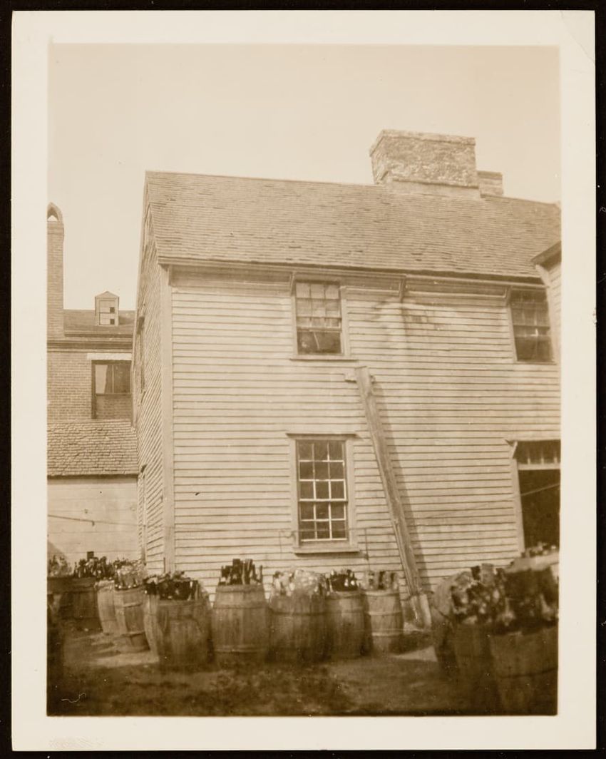A group of workers pose in front of the Harrison Gray Otis House in preparation for the widening of Cambridge Street. Jim McCool (middle of front row), foreman for Isaac Blair & Co., the move contractor, is shown in the middle of the front row.