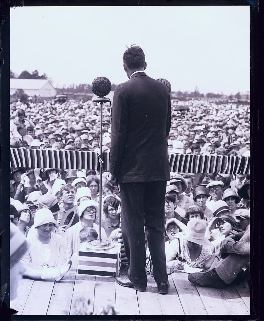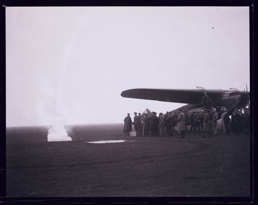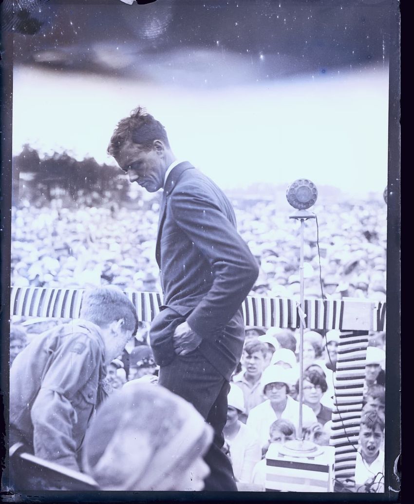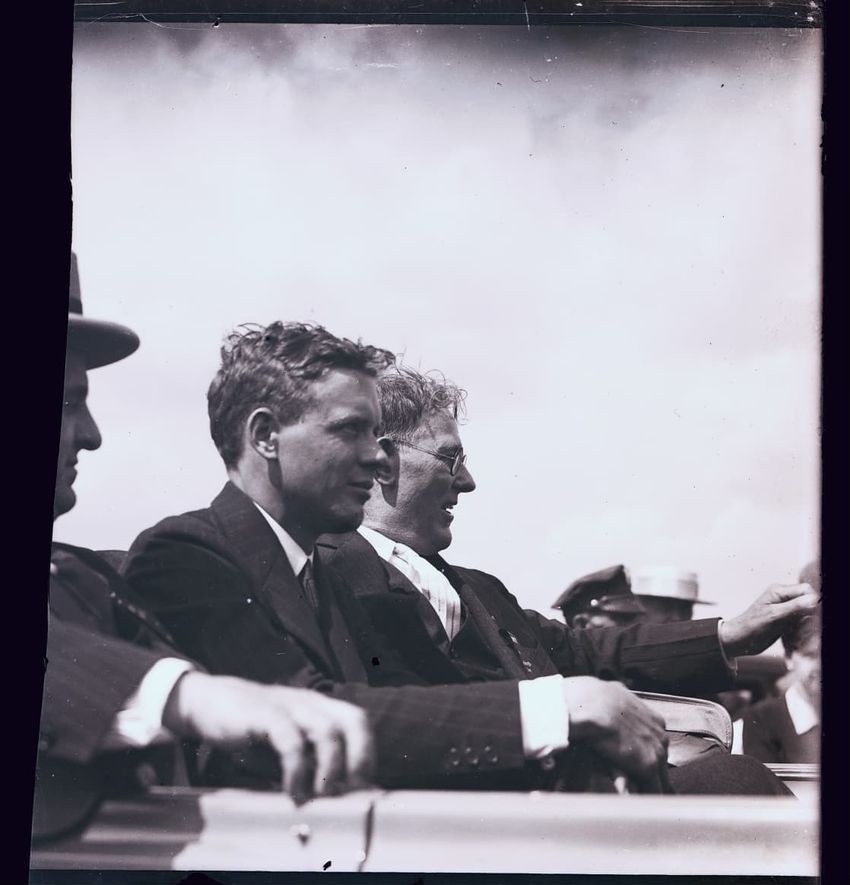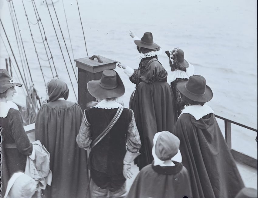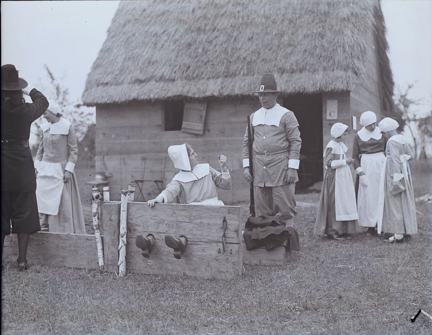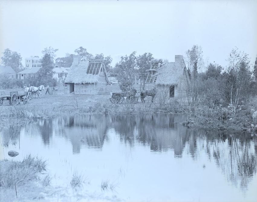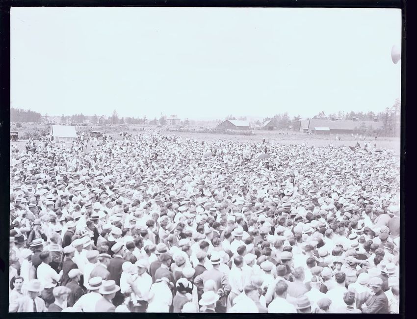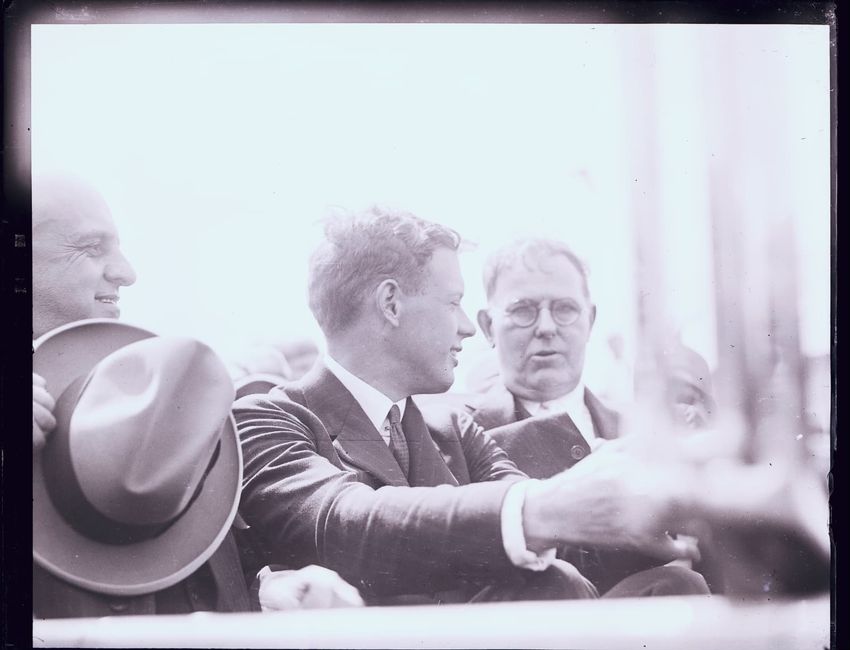 A group of workers pose in front of the Harrison Gray Otis House in preparation for the widening of Cambridge Street. Jim McCool (middle of front row), foreman for Isaac Blair & Co., the move contractor, is shown in the middle of the front row.