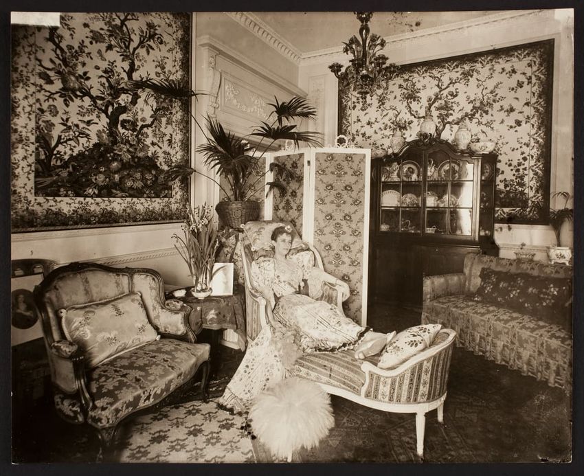 Interior photograph of Miss Lulu Palfrey in the morning room in the Arthur Little House, 2 Raleigh St., Boston, Mass.