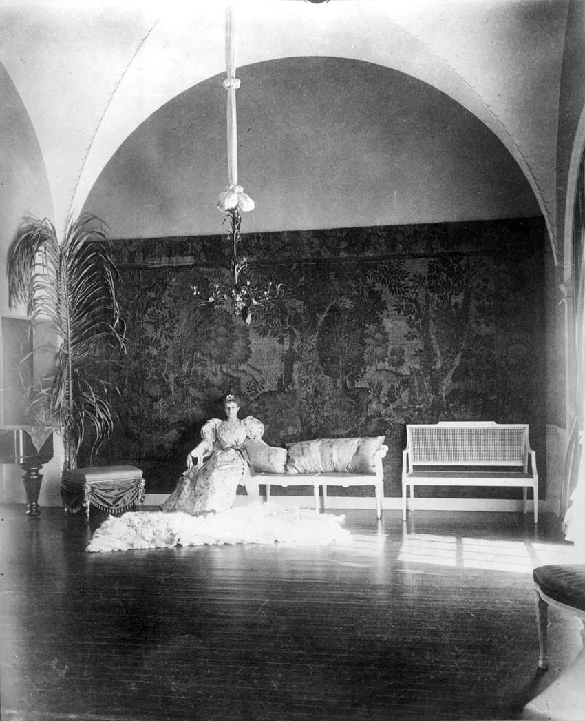 Interior photograph of Miss Anna Palfrey in the ballroom of the Arthur Little House, 2 Raleigh St., Boston, Mass.