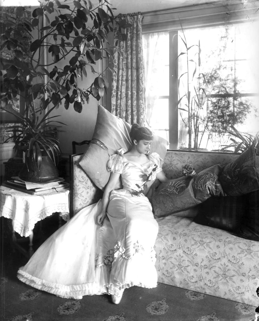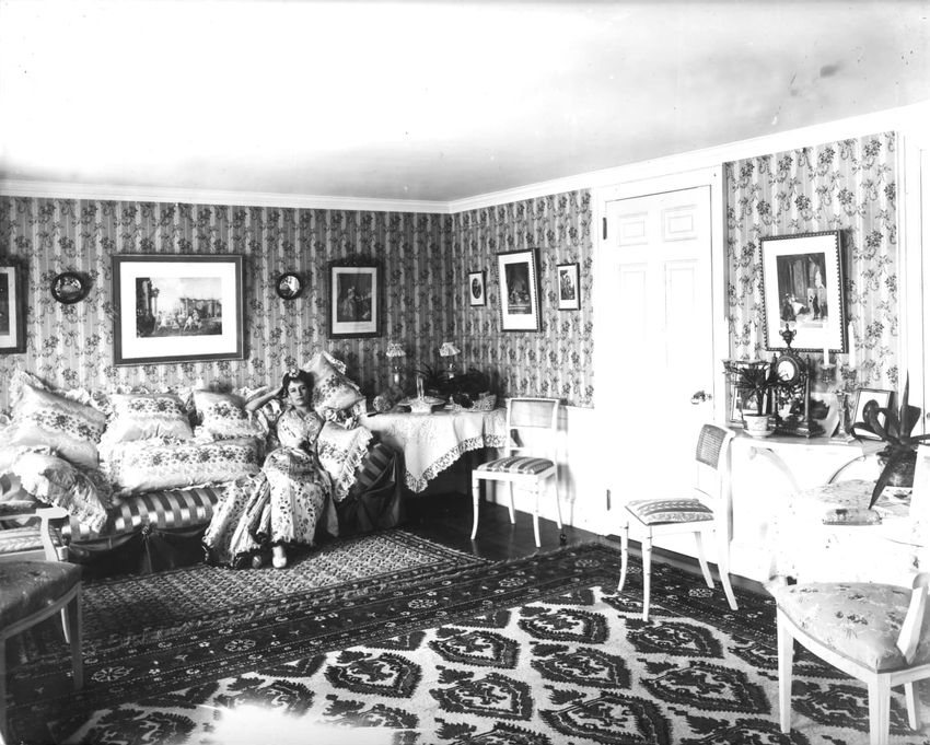 Miss Anna Palfrey, who married Bryce Allan about 1899, reclines on a chaise lounge in the breakfast room. The verso states the walls have the original toile de Jouy. The house was built in 1892.