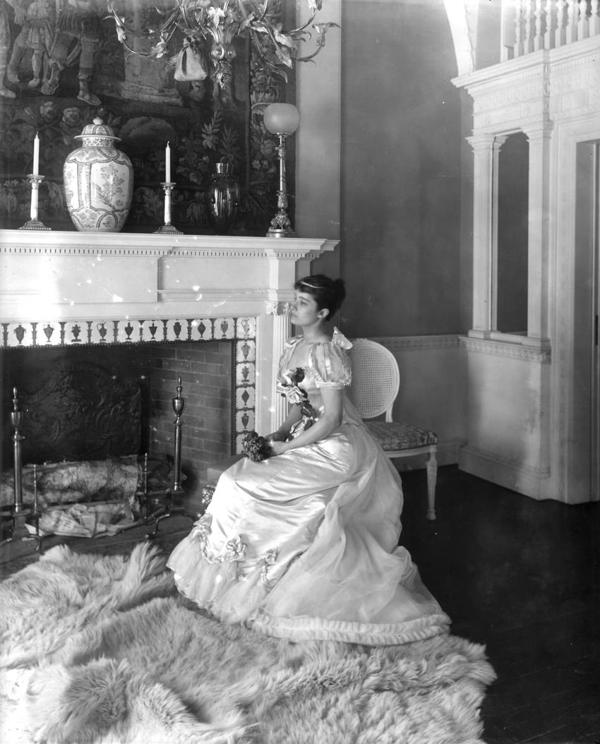 Interior photograph of Miss Lulu Palfrey in the ballroom of the Arthur Little House, 2 Raleigh St., Boston, Mass.