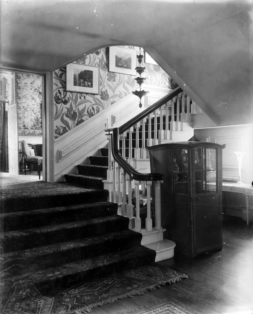 Interior photograph of a stairwell in the Arthur Little House, 2 Raleigh St., Boston, Mass.