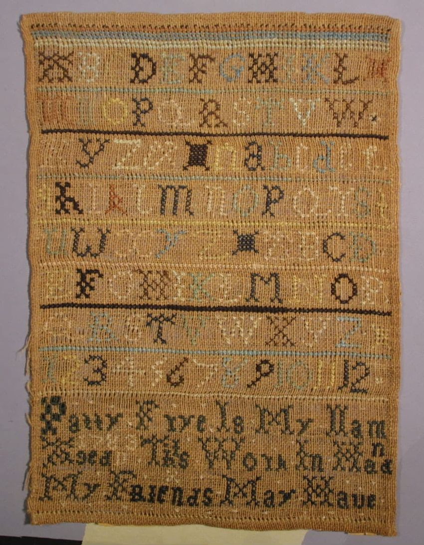 Alphabet Sampler with floral border. Vertical rectangle. Natural linen ground. Silk thread. Alphabets occupy top two-thirds of space. Blue lettering. Flower border, polychromatic. Alphabets: #1 complete, #2 missing "J", #3 missing "J" Numbers: "1-9,0"; cross stitch, satin stitch, French knots.