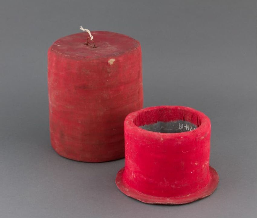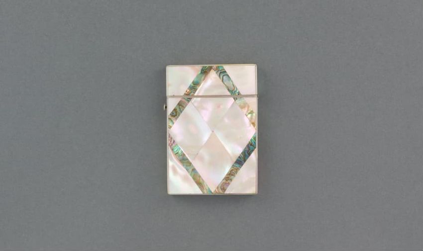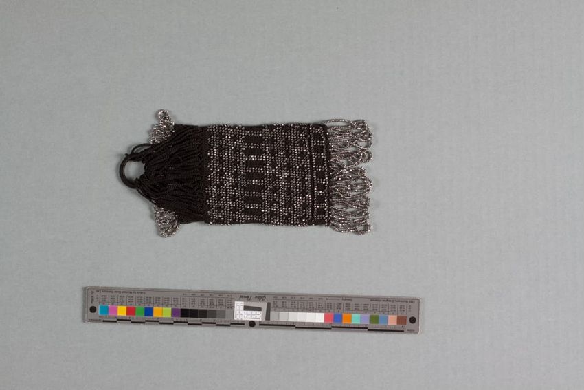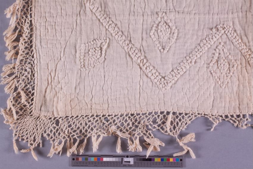 block printing (relief printing process), chintz, cotton (textile), fringe, glazing (coating), stitching, weaving, machine-made, piecing, tabby (textile), alteration (process and technique), tin (metal)