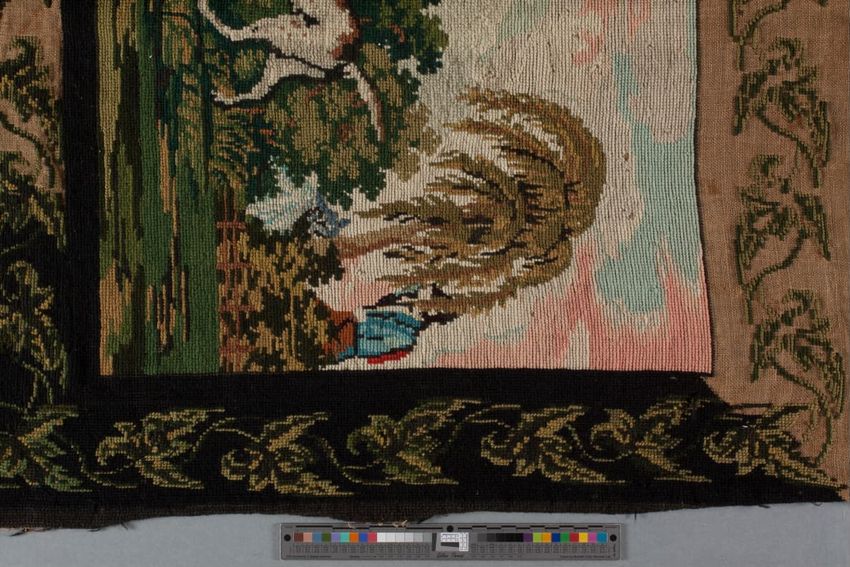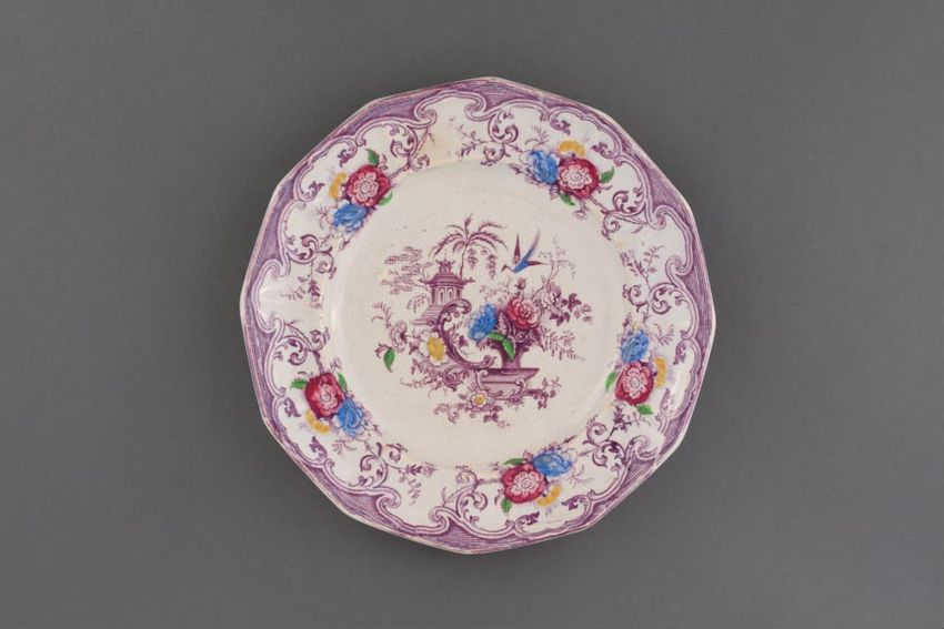 Earthenware plate with purple transfer-printed vignette of pagoda, vase with flowers and exotic bird. Hand-painted overglaze in blue, yellow, red and green is applied to flowers and leaves. Border pattern of scrolls and sprigs.