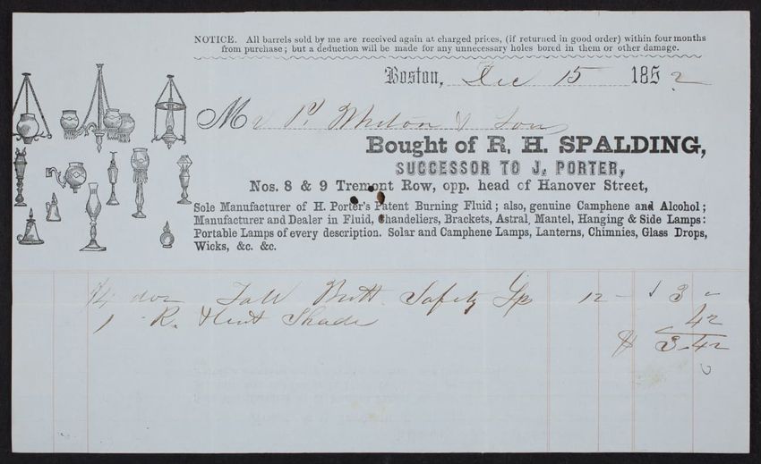 Spalding is the sole manufacturer of H. Porter's Patent Burning Fluid.