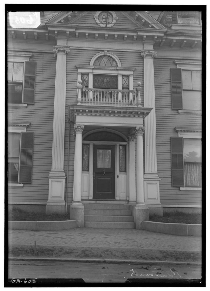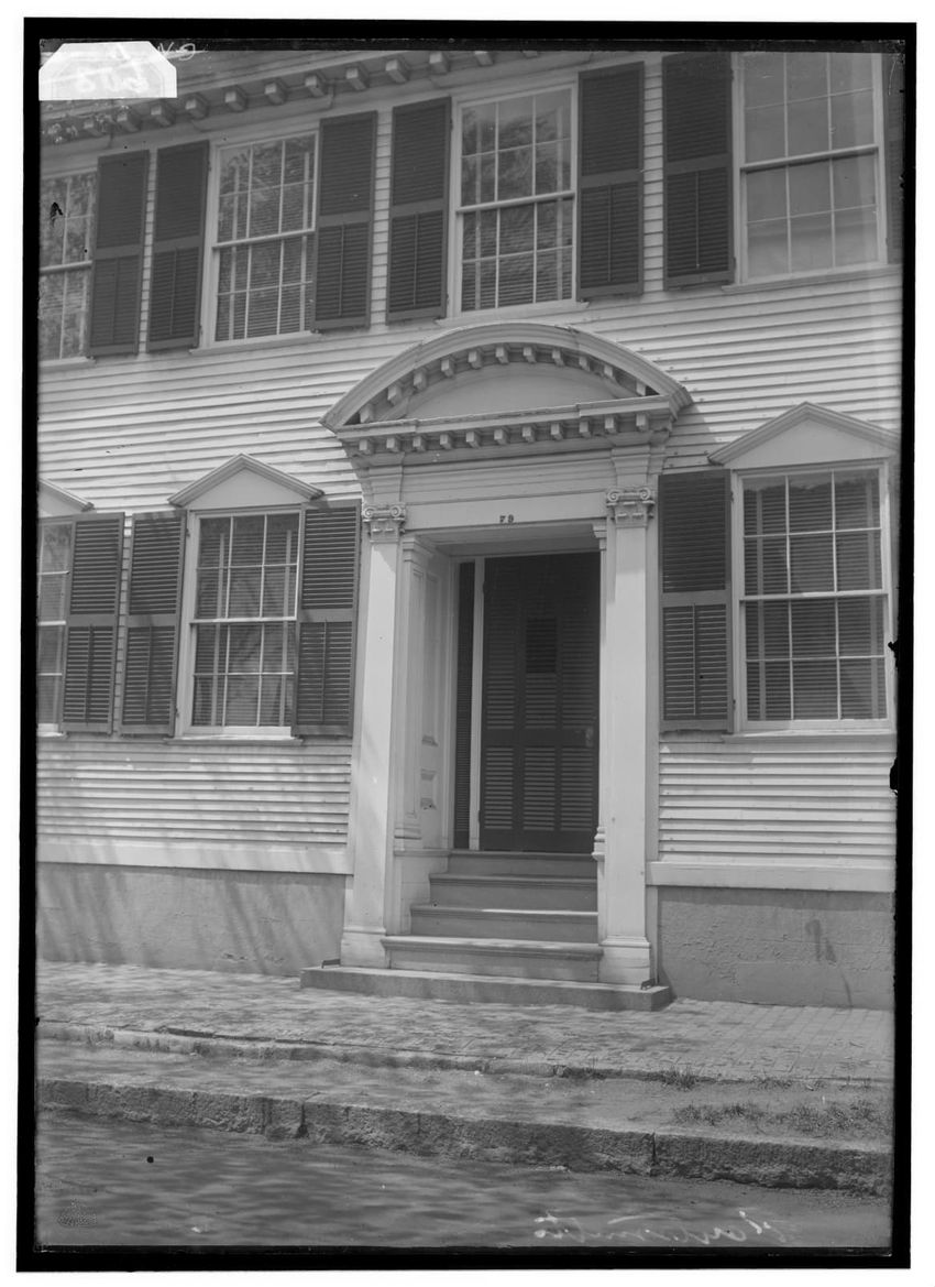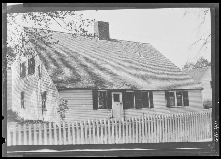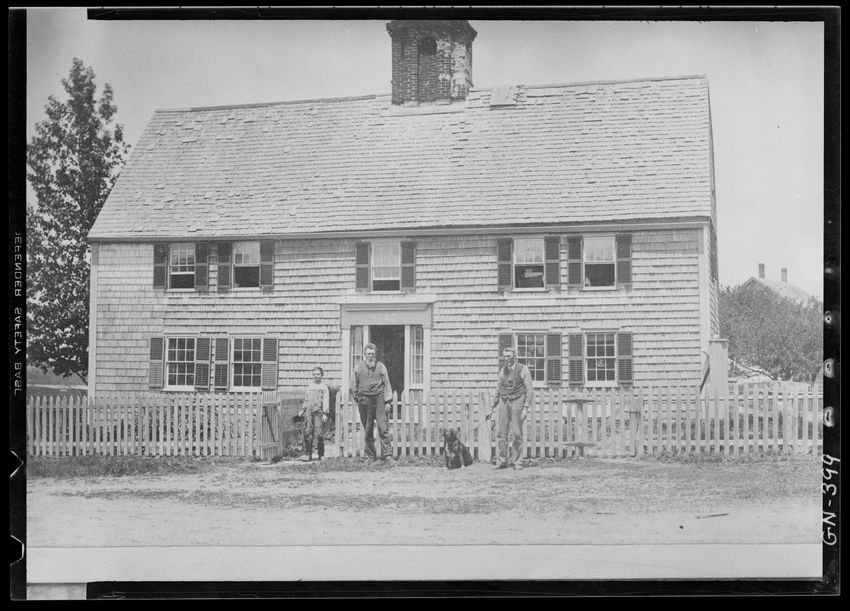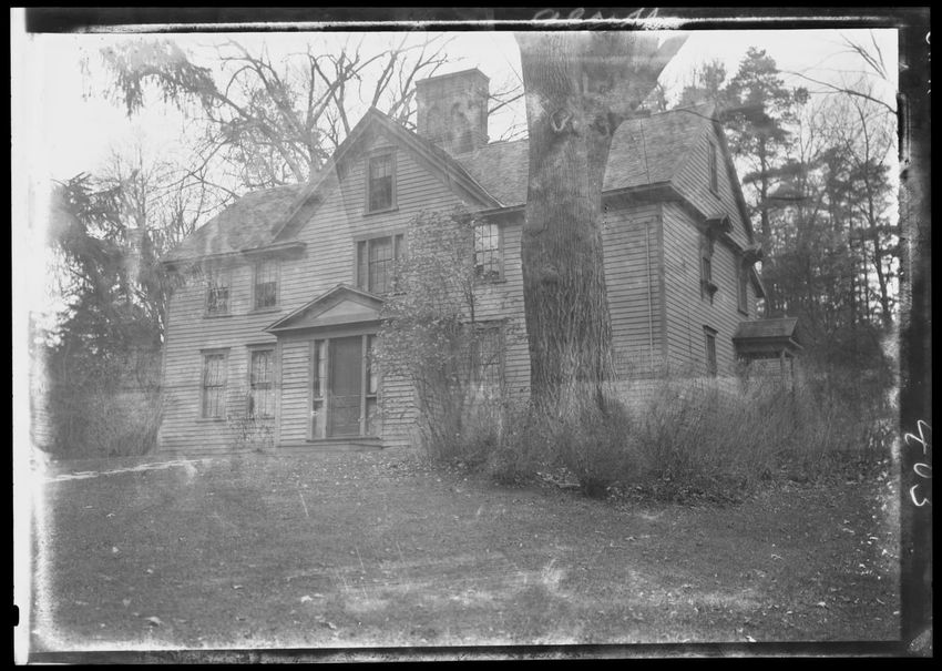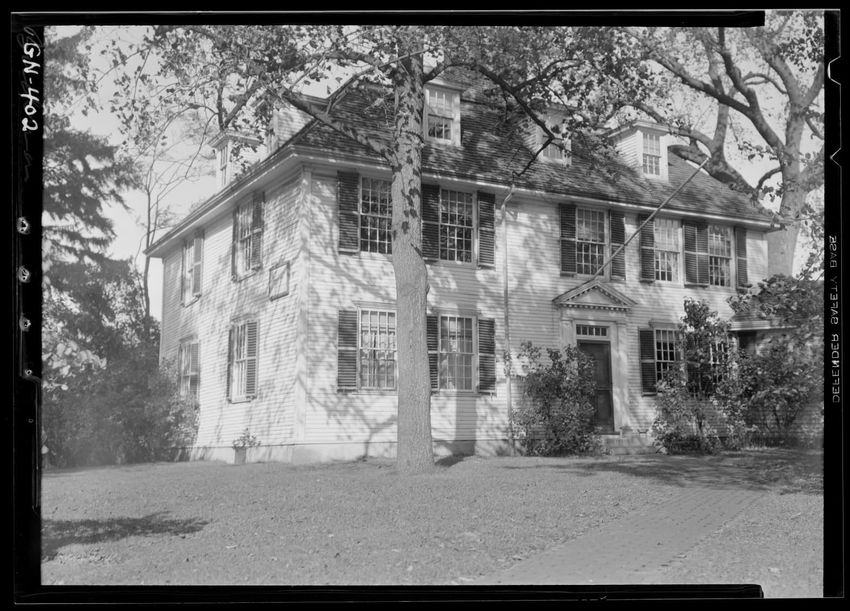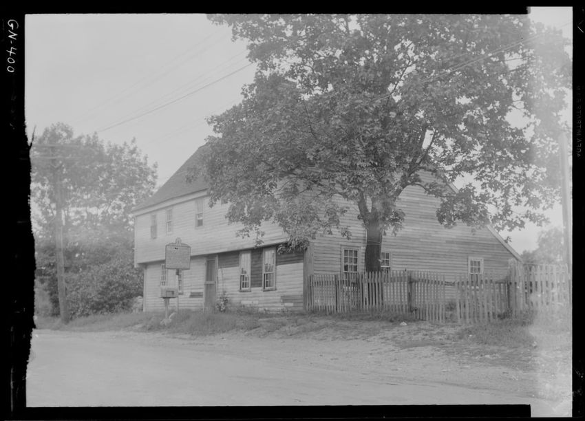 The image depicts the Wright Tavern in Concord, Massachusetts. It is a two-story building with white siding, dark shutters, and multiple chimneys. There is a bicycle propped against the front of the building and a sandwich board sign near the entrance advertising dinner, luncheon, supper, and tea. B...