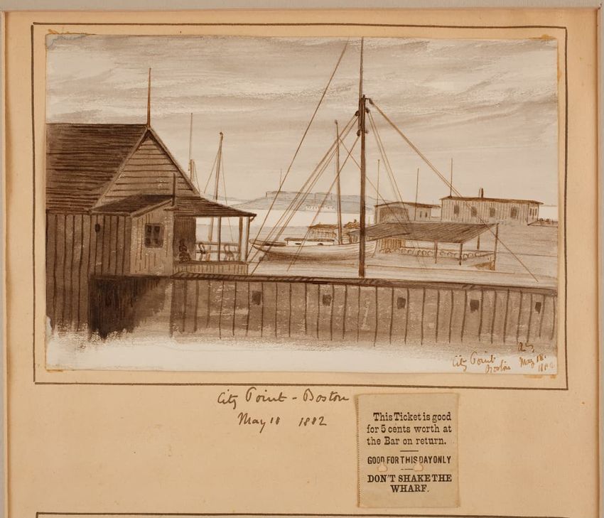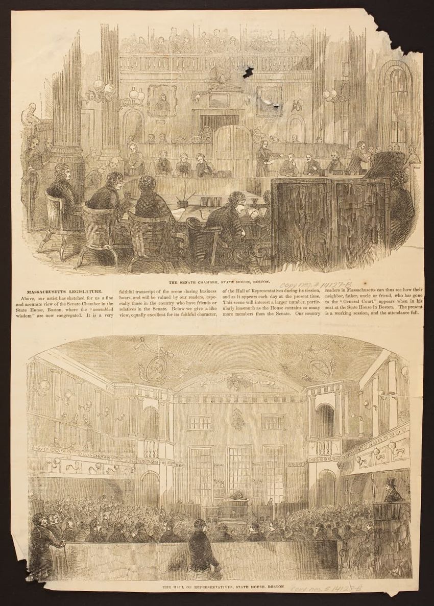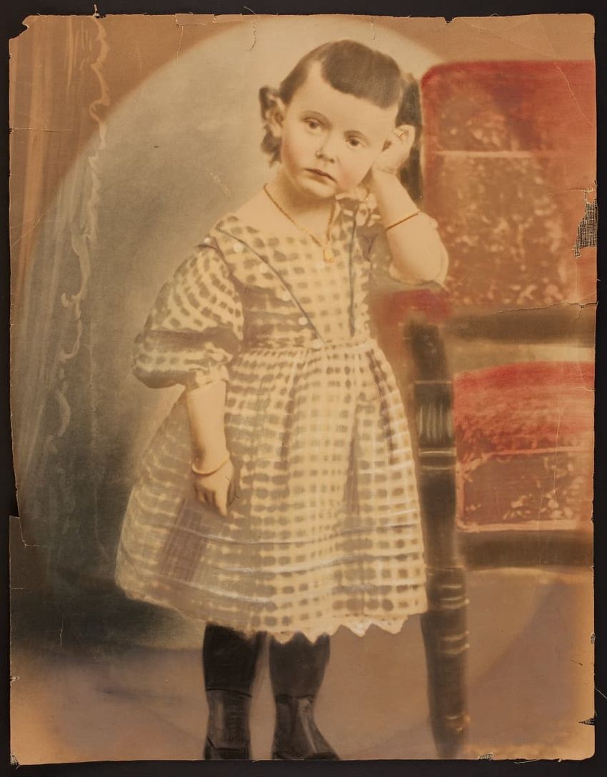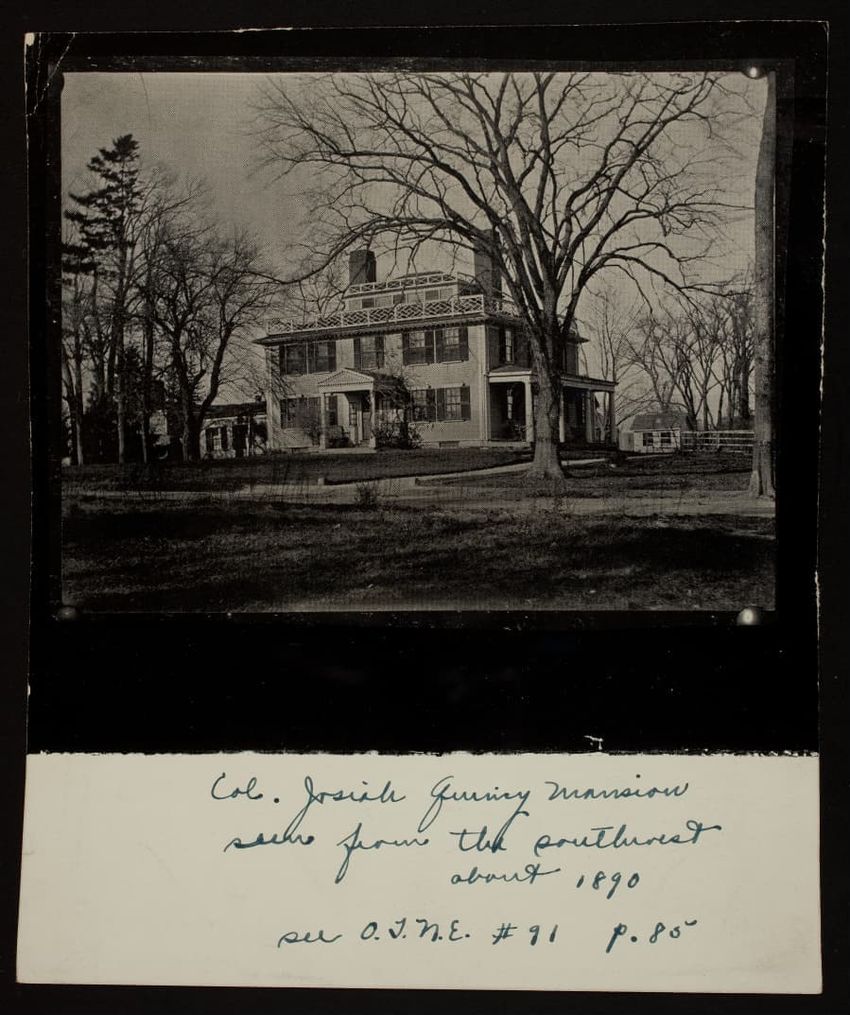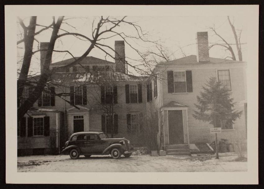 A female model, in period costume, trims a bonnet in front of a fireplace at the Cooper-Frost-Austin House, Cambridge, Massachusetts. The image verso has: "Cooper Austin House, Cambridge, Mass., 3 Jan. 1916 WSA."