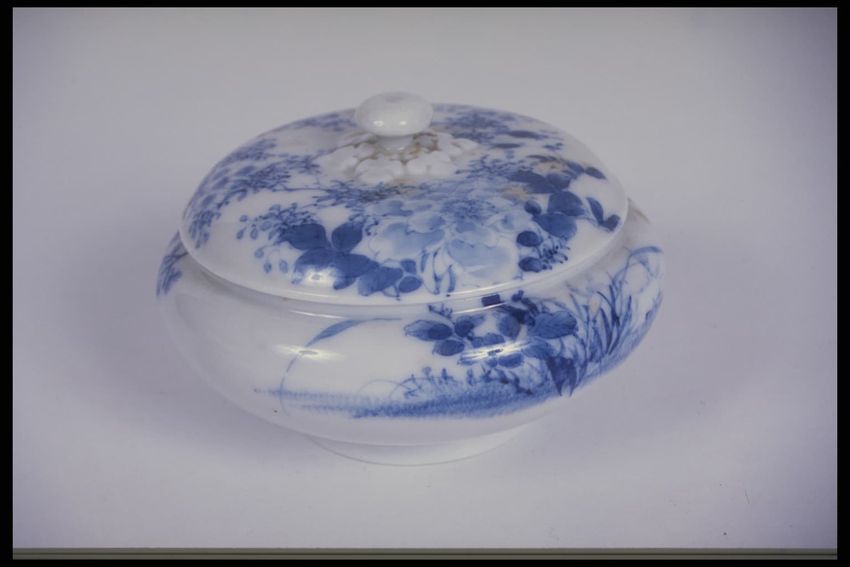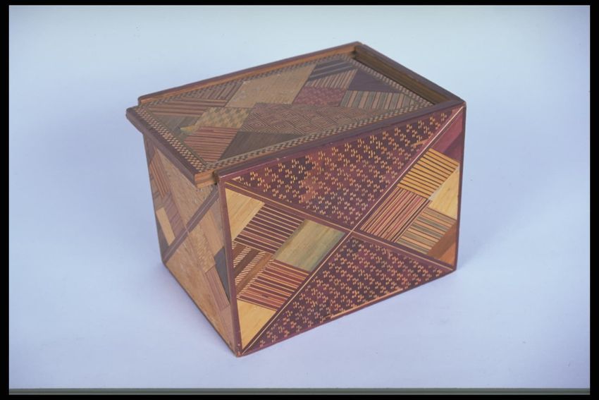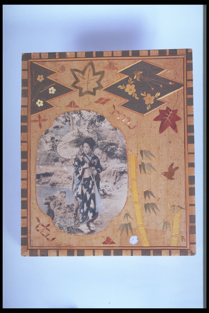 Covered box w/ applied Japanesque decoration, including photo of Japanese woman w/ umbrella on top. Straw pieces in shape of bamboo, bird, oak leaves, flowers and border around photograph. Straw border w/ tan and brown stripes.