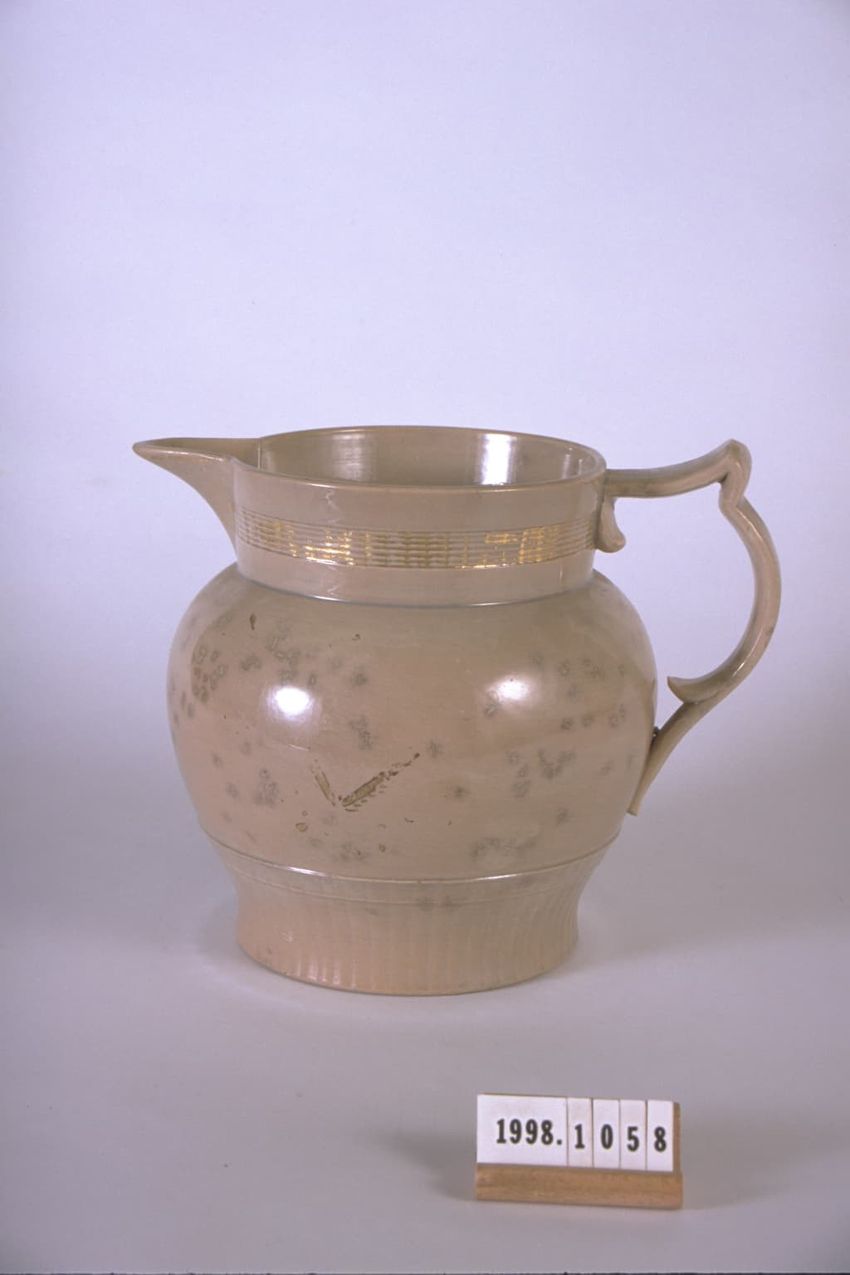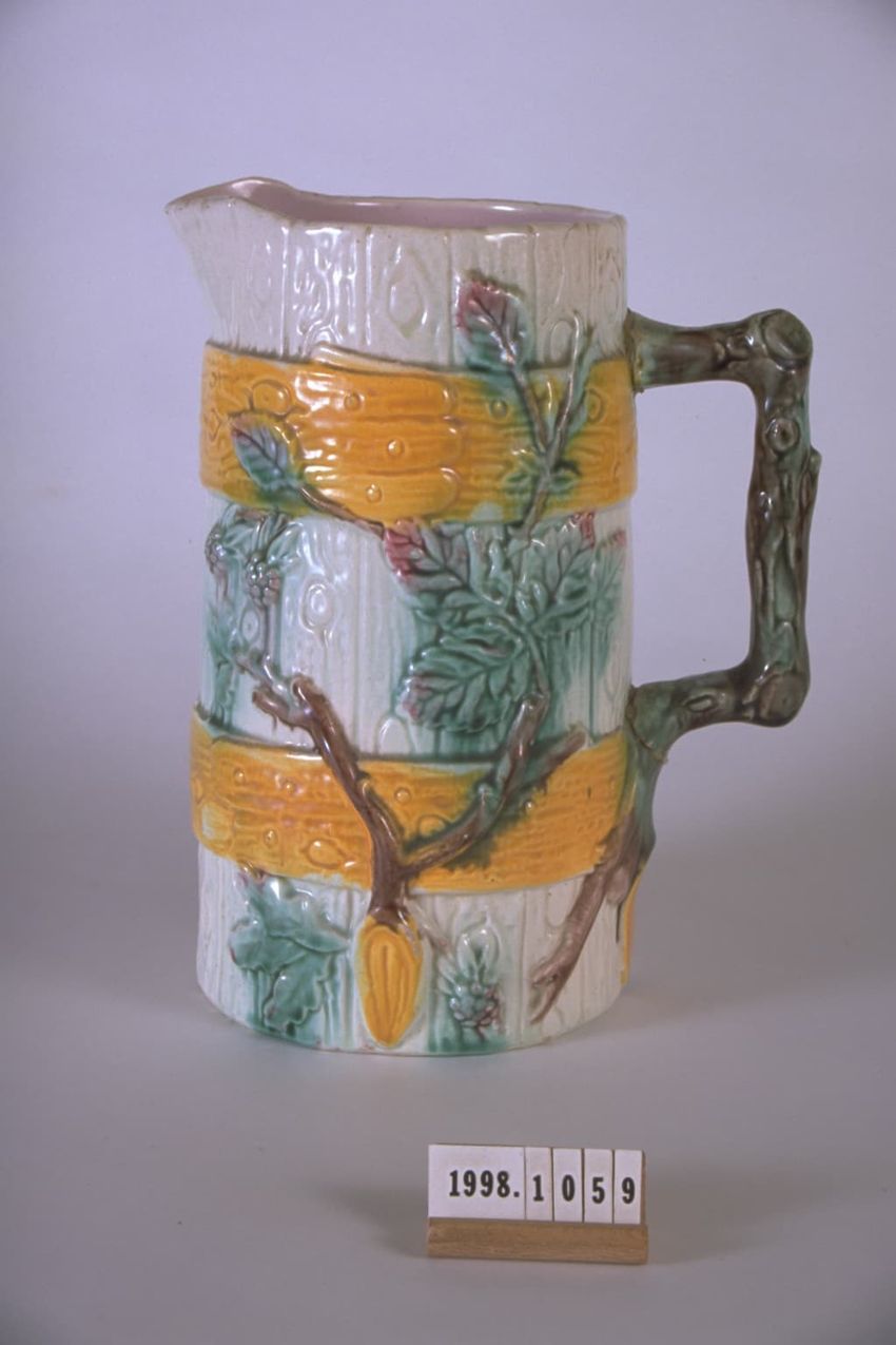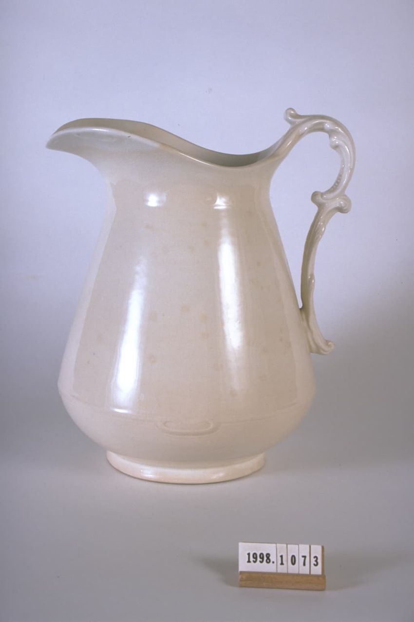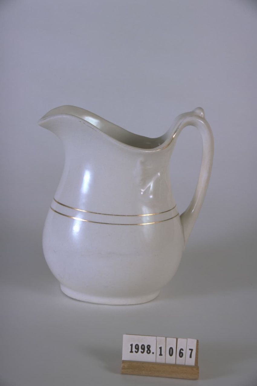 Earthenware. Part of toilet set consisting of covered slop pail, 2 pitchers, small jar and wash basin; white w/ brown and pink floral branch decoration; scalloped and gilded edges; ribbed necks.