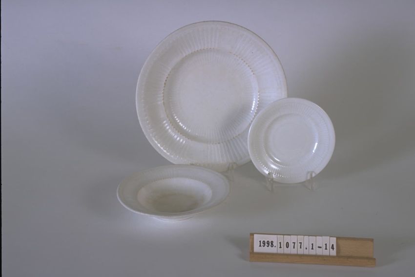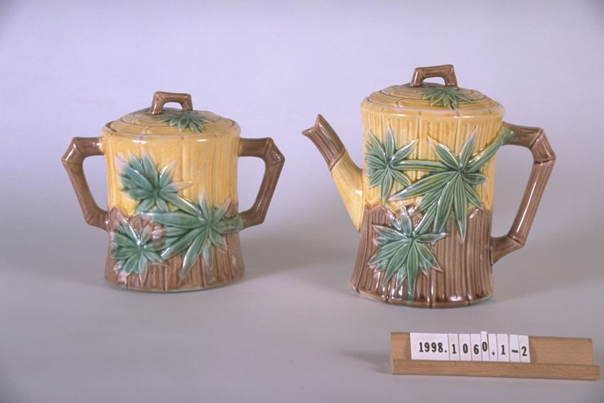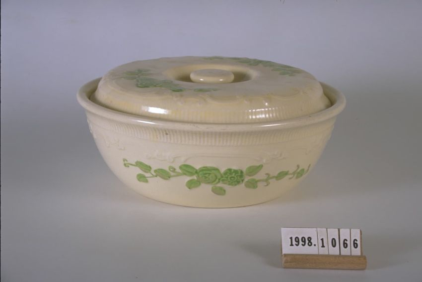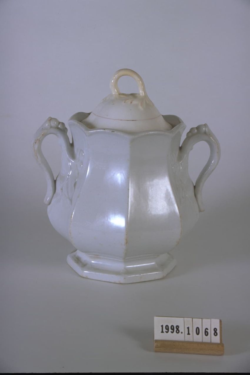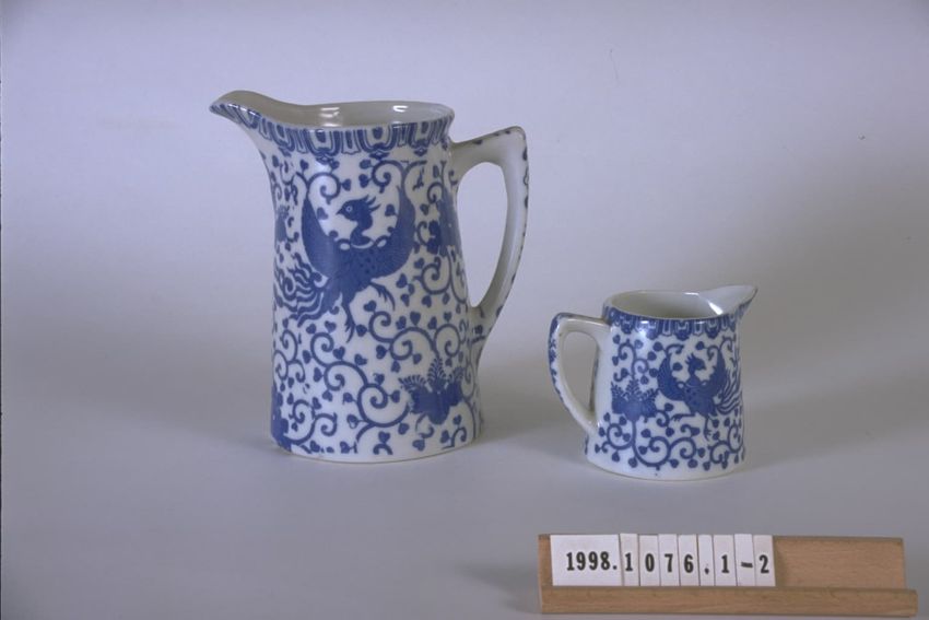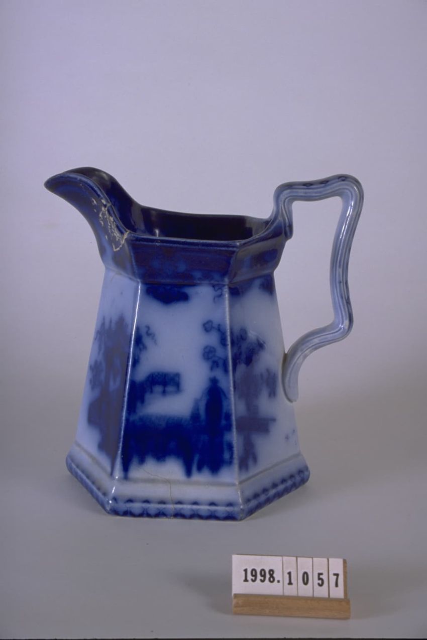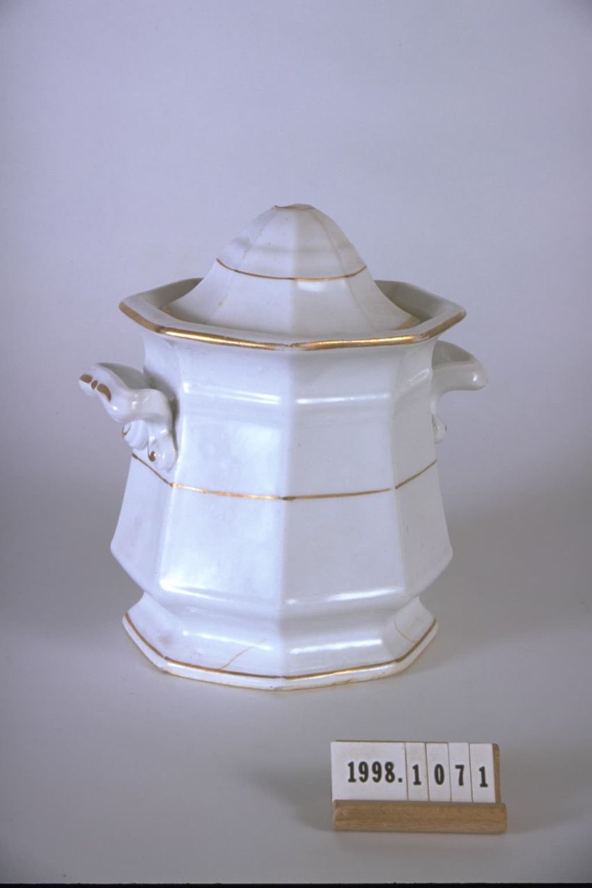 Earthenware. Part of toilet set consisting of covered slop pail, 2 pitchers, small jar and wash basin; white w/ brown and pink floral branch decoration; scalloped and gilded edges; ribbed necks.