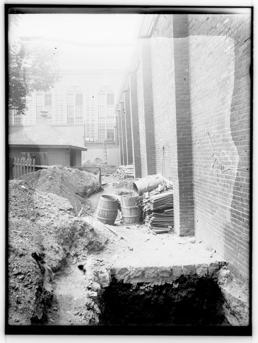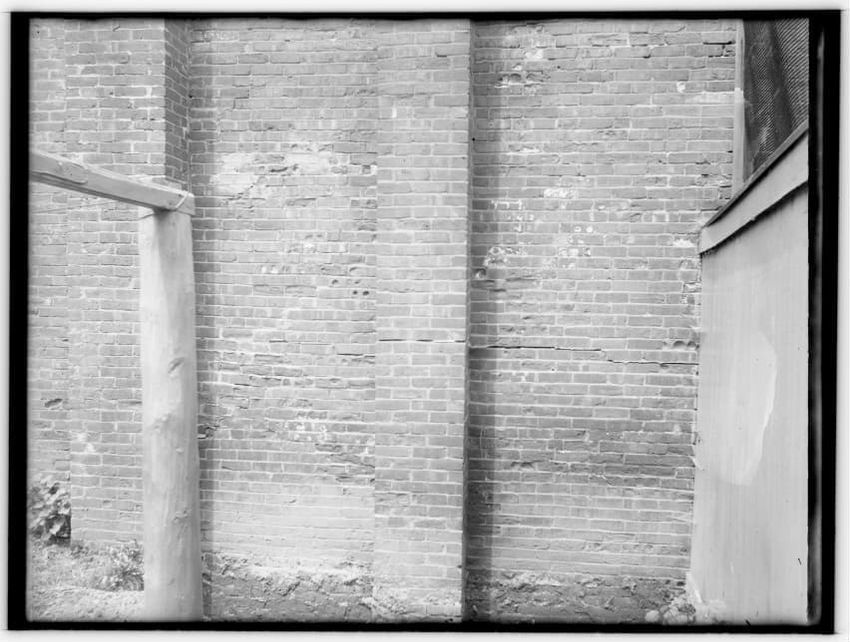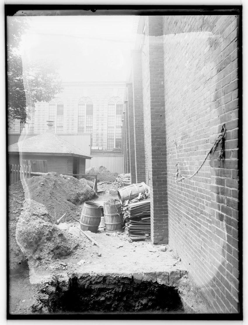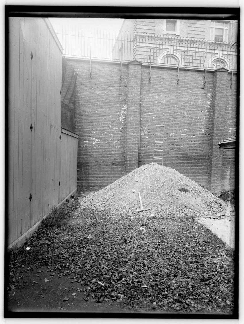 The image depicts a brick wall of the Charles Street Jail's Fruit Street side in Boston, Massachusetts. In front of the wall, there is a large pile of dirt or rubble, with a tool, possibly a shovel, sticking out from it. To the left, a wooden structure is visible, and part of the jail building can b...