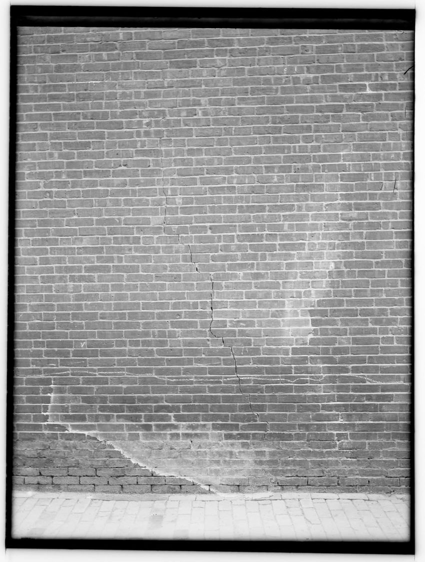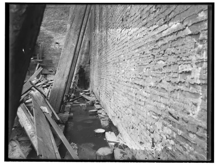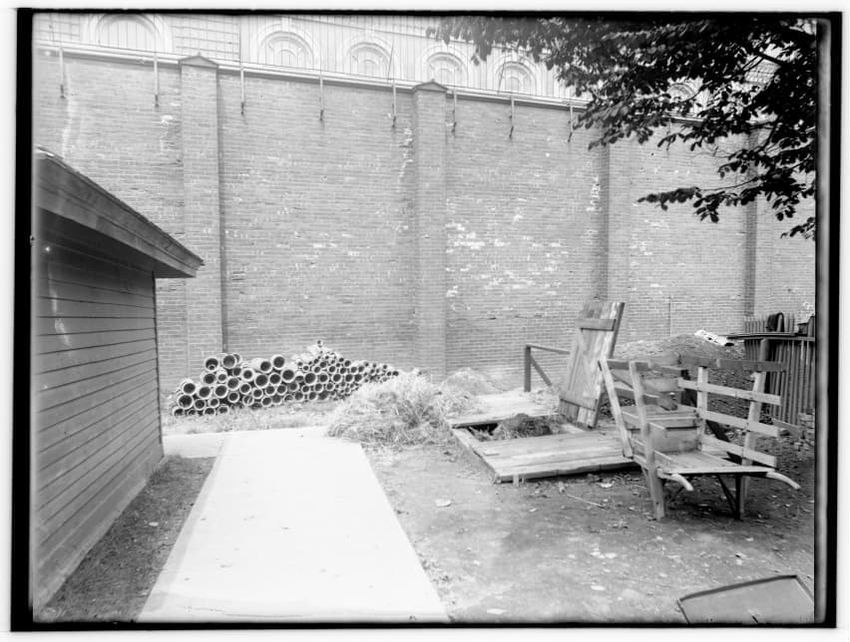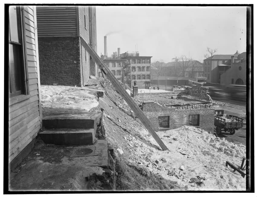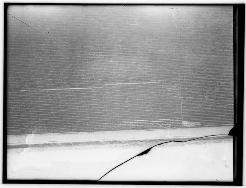 The image depicts a brick wall of the Charles Street Jail's Fruit Street side in Boston, Massachusetts. In front of the wall, there is a large pile of dirt or rubble, with a tool, possibly a shovel, sticking out from it. To the left, a wooden structure is visible, and part of the jail building can b...