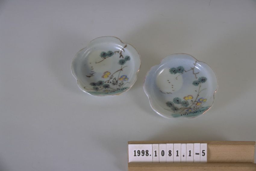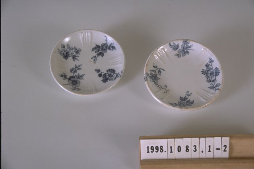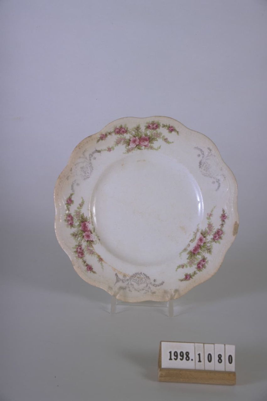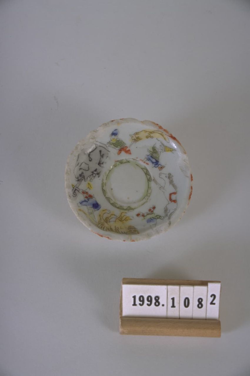 Possibly child's saucer decorated with circus animals; remnants of red banding on edge; "circus ring" in center; four clowns pictured with elephant, tiger, horse and ferret-like creature.